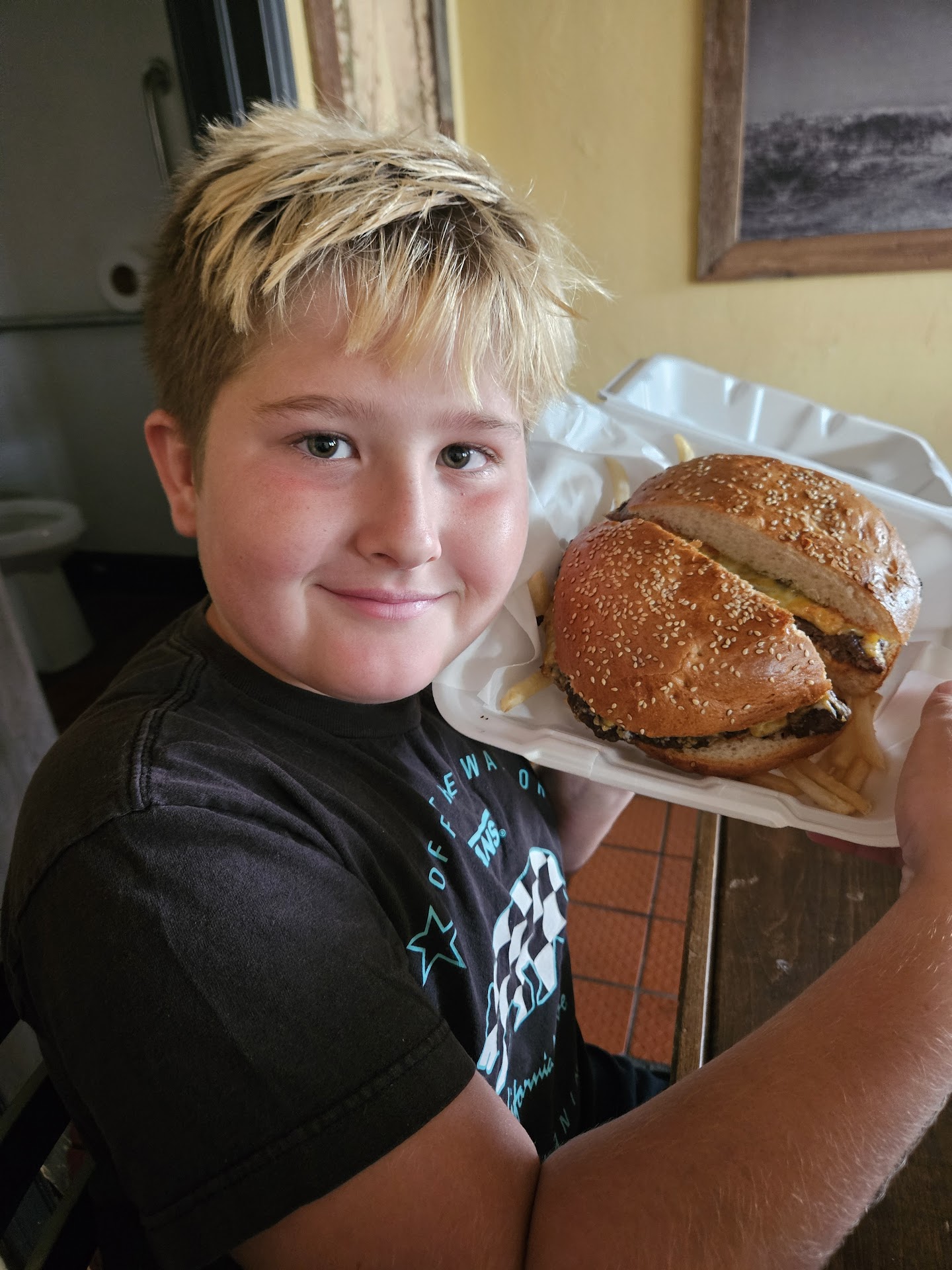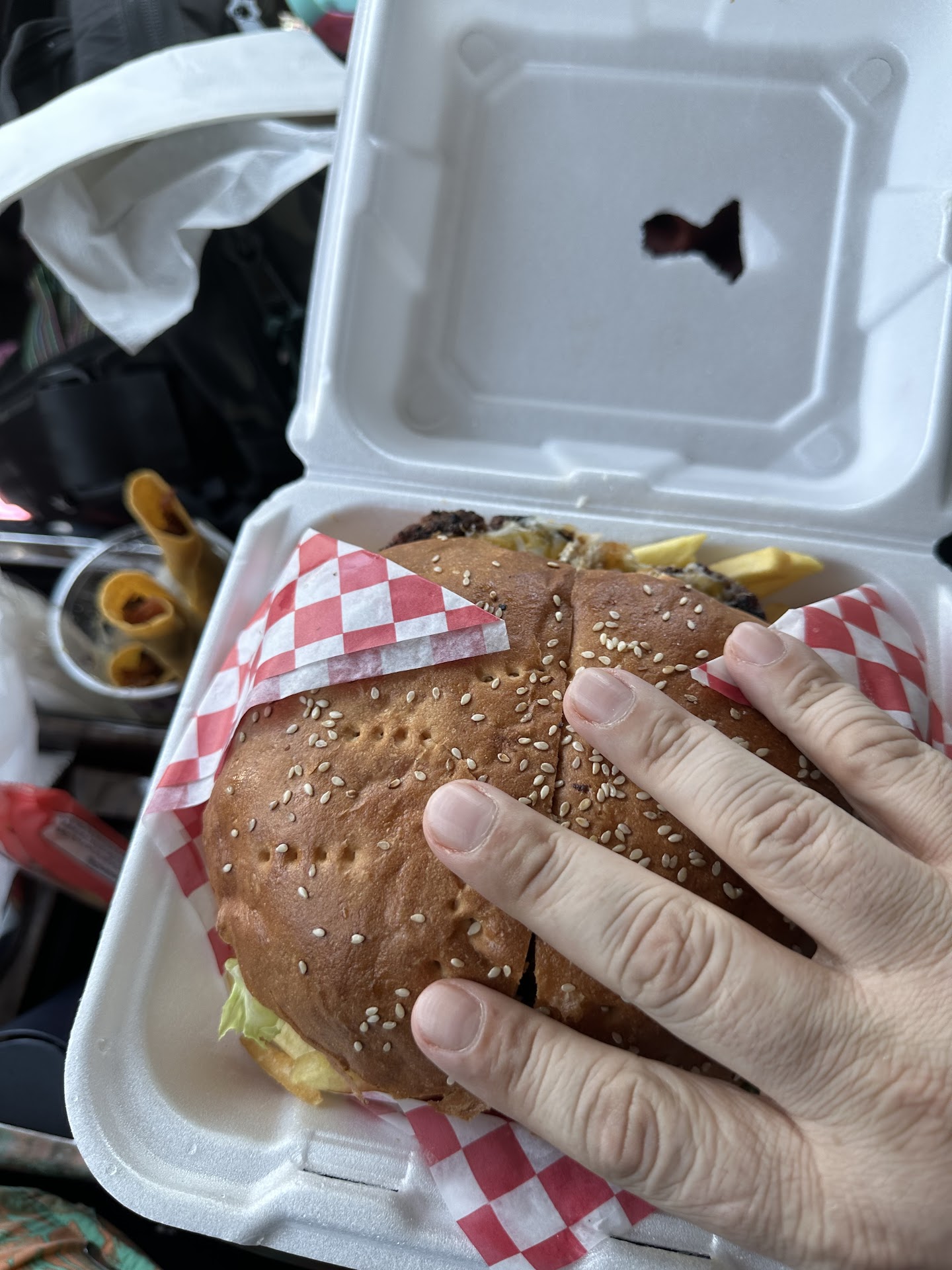 OMG I love this place. I just got a burger instead of a pollo entero. It. Was. HUGE! Roasted Chile, Swiss, avocado, salada, and roasted Chile sauce on the side. I didn’t even touch the ketchup they sent.