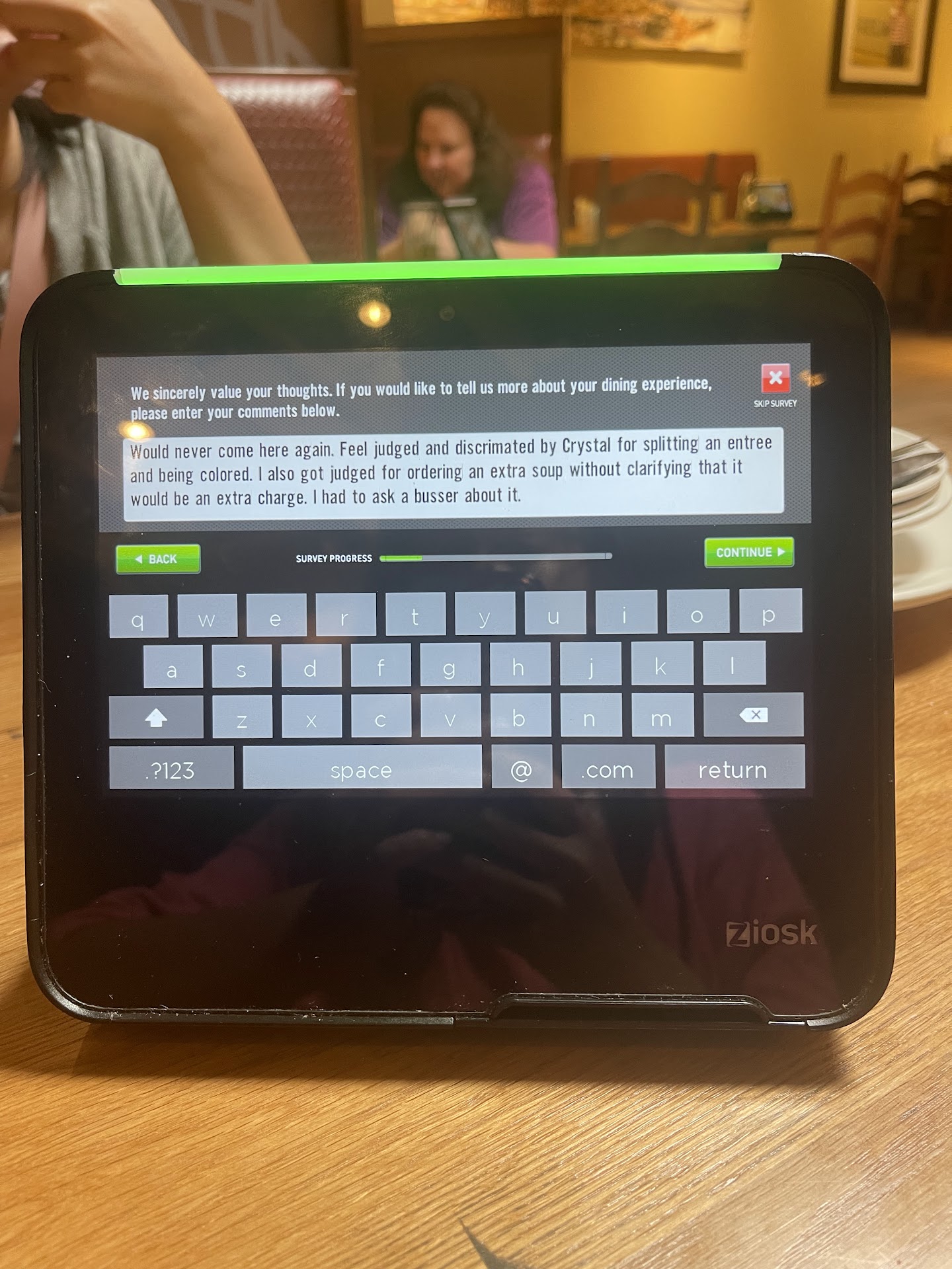 The upside to the whole experience was we had outstanding service! Even as we were finalizing our bill I had our server Nicole guide me through the self checkout process. It’s not that I failed but the table unit froze. She cheerfully took our gift card & credit card and brought back the final bill.