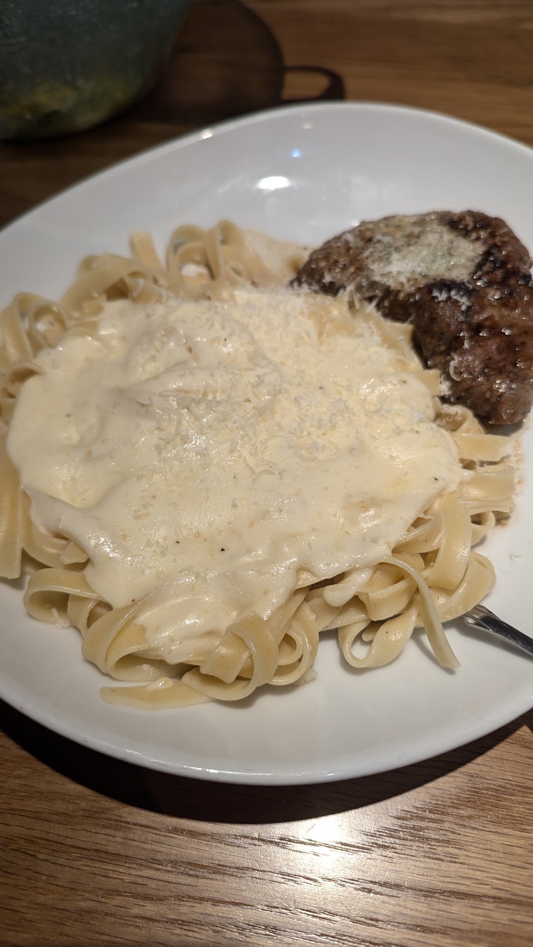 My wife chose the 6 oz sirloin served with a side of Fettuccine Alfredo. It was a disappointment to her and I had to taste to agree. The meat was tough to cut, no steak knife was provided. The steak lacked overall flavor! When dining at an Italian restaurant I would advise against getting steak.