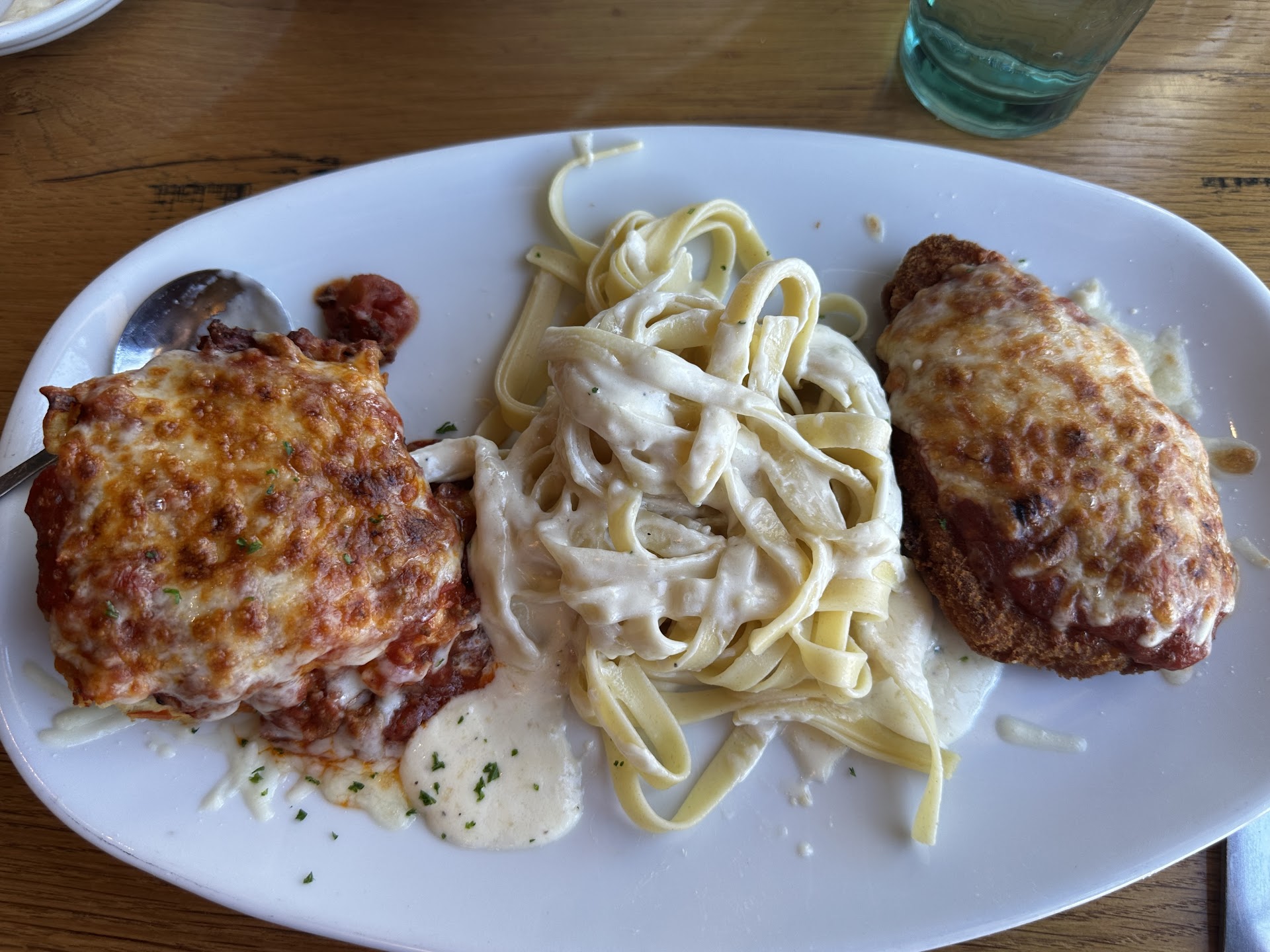 I looked at the Lasagna Classico and much to my surprise this one contained no Ricotta cheese. The menu indicated it only had Parmesan, Mozzarella, Pecorino Romano and Meat Sauce. I’m just not a fan of ricotta cheese! I thought my decision was made until my wife suggested the Tour of Italy which odd what I selected. This included the Lasagna Classico, Chicken Parmigiana, and the Fettuccine Alfredo. Thank goodness I made the change!