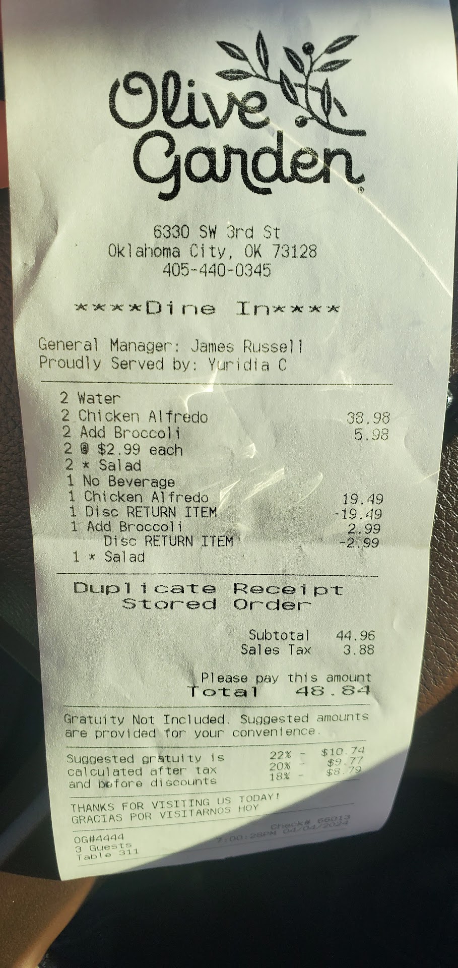 It took quite a while for our server to finally greet us. She didn’t give us silverware or anything. Took our drink orders. Came back with our water and bottled beers about 8 minutes later then just walked away. I was assuming she was getting the complimentary breadsticks and salad that so many love Olive Garden for, She wasn’t. She came back to take our orders and I asked for the salad and breadsticks.