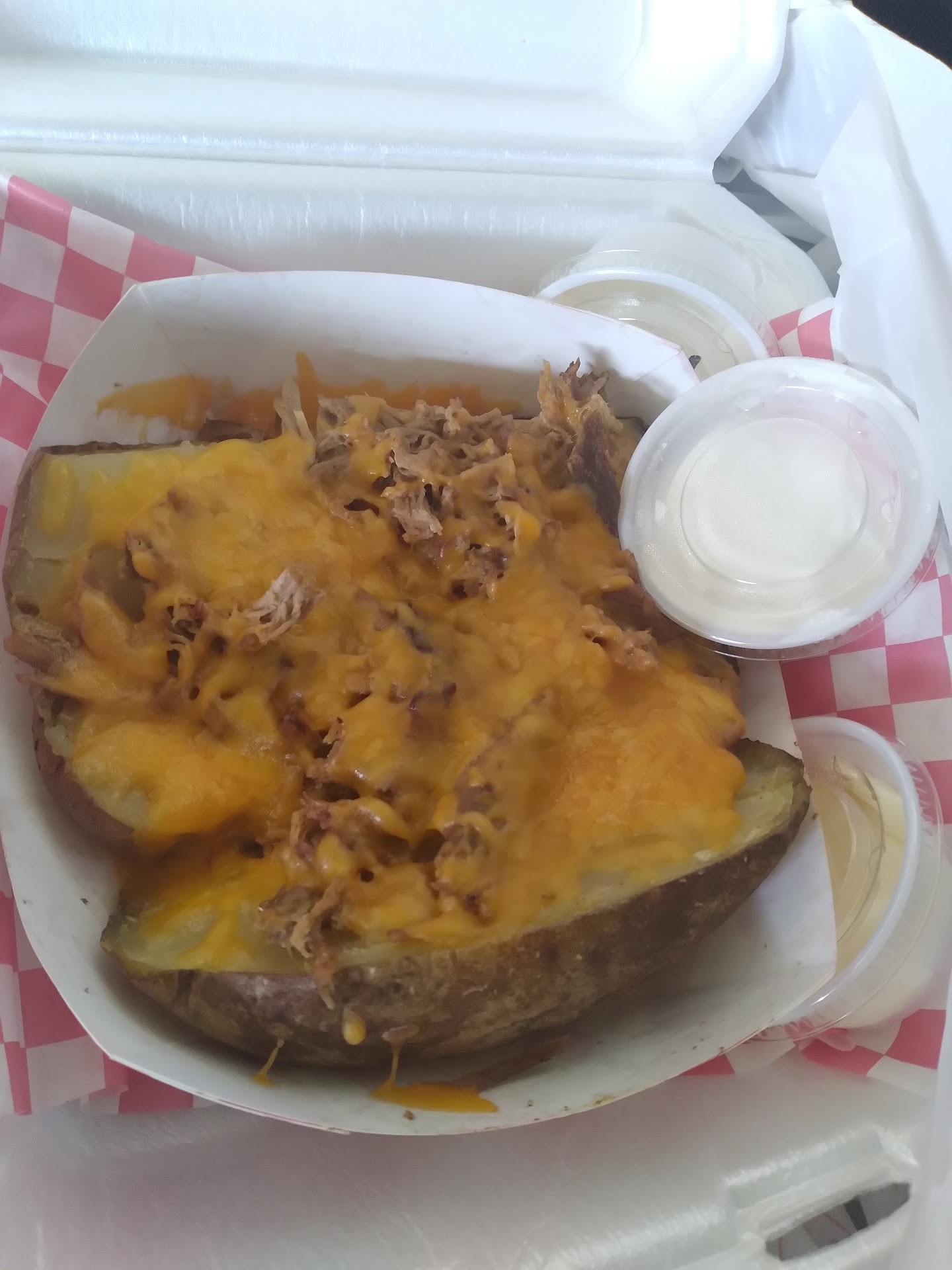 The service was slow and disjointed. After a confusing exchange with the owner, who seemed distracted (perhaps by her plate of Mexican food at the kitchen table), I settled on a loaded baked potato with meat, cheese, and, for an additional 75 cents, ranch dressing. Yes, ranch, apparently a luxury item here. The water came in a small plastic cup, and my friend and I waited longer than expected for BBQ, a cuisine typically served quickly.