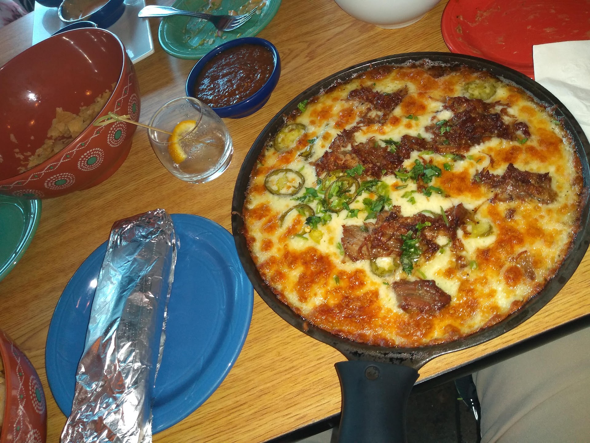 Read moreSeated fast in a semi full restaurant... The place had TVs in sight from any table. The host staff was jovial and awesome. (Co-workers get together is what brought me here) We were taken care of in a VIP fashion by an always smiling (red hair gentleman) forgot his name....maybe I can blame the tequila? He was super awesome! Anything we asked he got for us! It was a truly VIP experience. The ticket got picked up by the big time people at the table.{didn't change my style of ordering} Chips - salsa and queso, guacamole flights were ordered and when they say good they are joking. The red salsa was fresh and tasty. The chips came out hot & fresh. Entree wise I had the queso fundito with pork carnitas meat instead of chorizo with tortillas The portion on the grillplate could have fed the table of all 10!!!! The grill cast iron plate it was delivered on might have been 18in of circumference. Check the picture. Hot and delicious it was. I would order 10/10 times again. I like the place !!!! Margarita Flight was an interesting experience. A delicious one at that... My watermelon Marg got switched out from a co-worker at the table so in essence I had two Habanero tequila margs. also a peach tequila one. I later had a Dos Equis lager to wash all foods down. This place has good food and phenomenal atmosphere in my opinion. I will return! Thank you again for the awesome experience and hospitality! Til next...