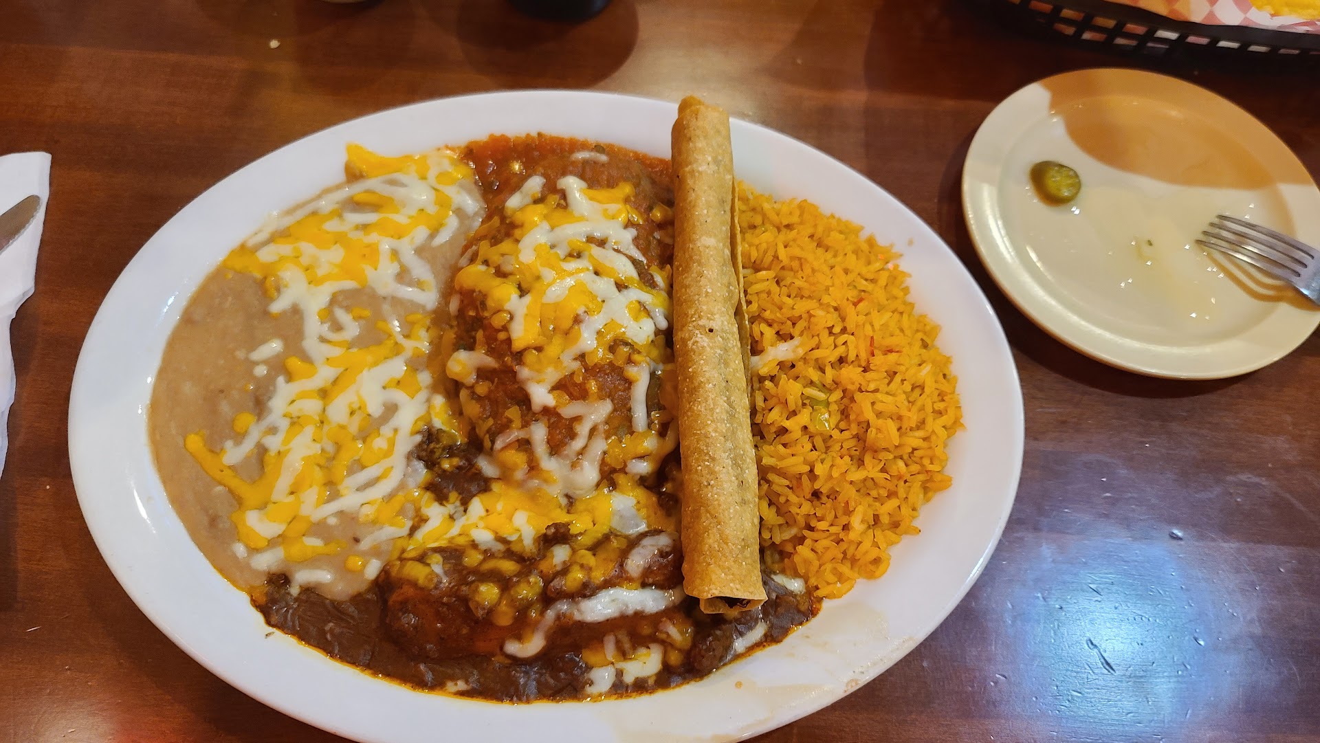 I chose the Burrito Loco, featuring grilled chicken, beef, and shrimp. The burrito was topped with red sauce and smothered in cheese. Rice and refried beans also came with the dish.