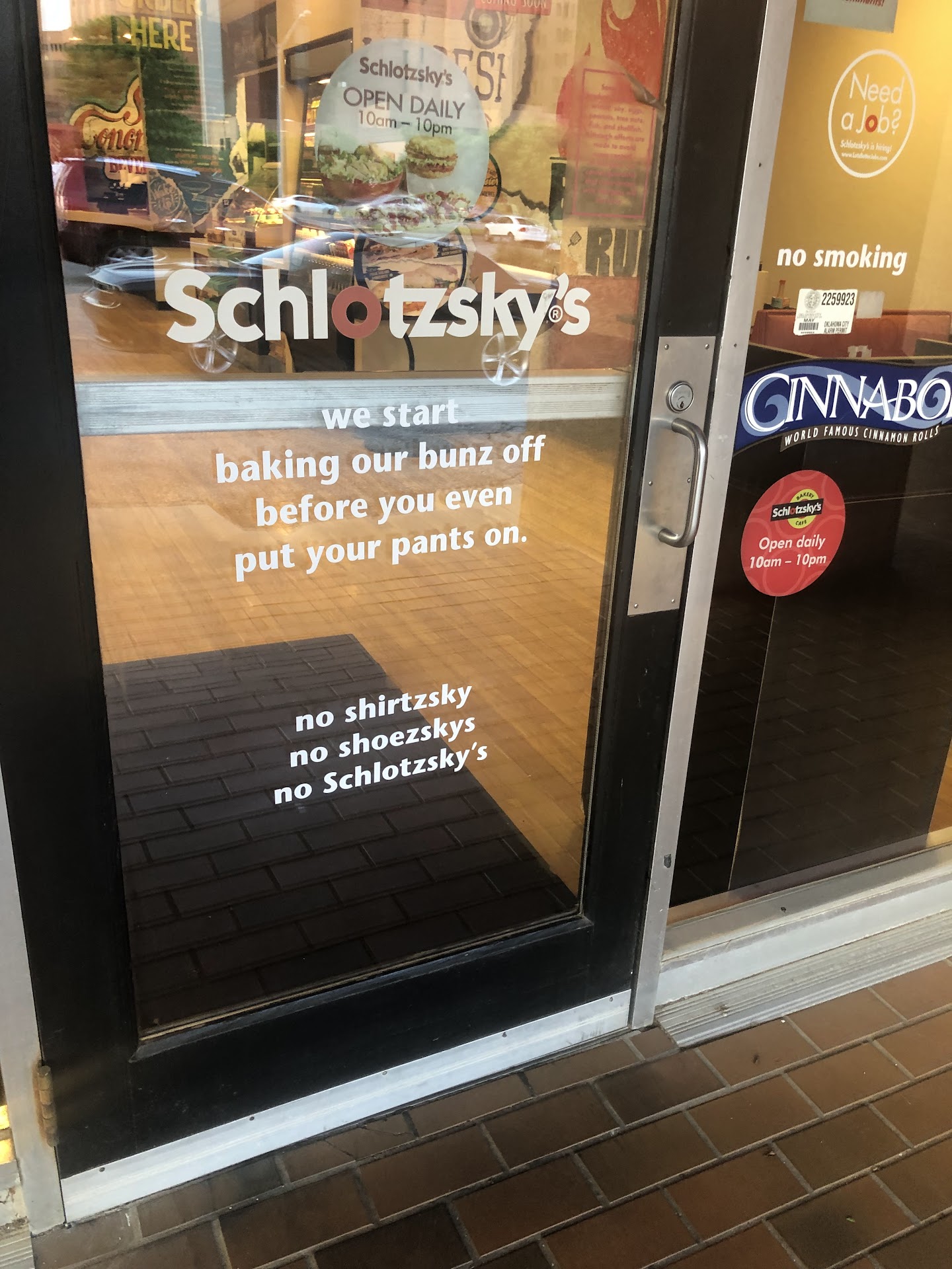 Read moreScholtzky's is a solid sandwich joint. The bread is unique, and is the cause for some to dislike the shop, but I think it is a positive signature on their sandwich. The food is nothing outstanding, but the reason it is getting 4 stars is because it is such an easy place to get a sandwich, and I get a really good vibe from the atmosphere. I think that Schlotzky's is underrated as a place to simply get a meal, and hang out with some friends for a bit. The other big plus for this sandwich joint is that they are open late in relation to other sandwiches. It is difficult to find a decent sandwich after 8:00pm, but they're open until 10:00. There's a special place in my life for...