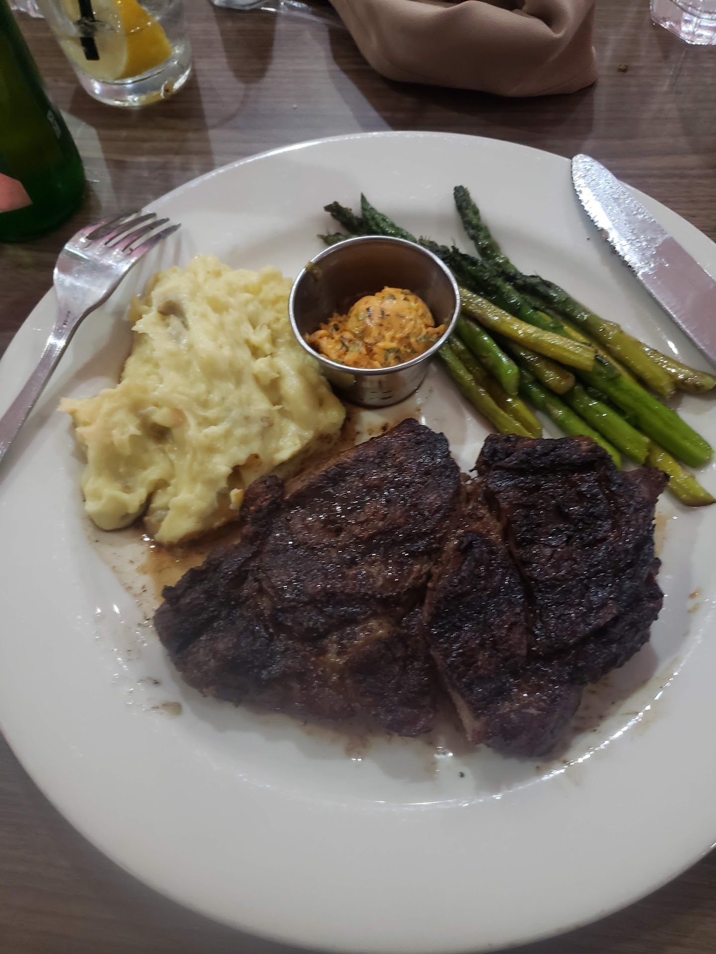 For the entrees, we ordered a ribeye steak and salmon. The steak was ordered as medium rare, and I have had rare steaks much more cooked than this was. The outside of the edge of the steak was a medium rare, while the inside was practically raw. there was also no seasoning to it at all. All I could taste was the butter that they put on it. The salmon was the same situation. I dont believe that any seasoning was used other than the butter that was on the top.