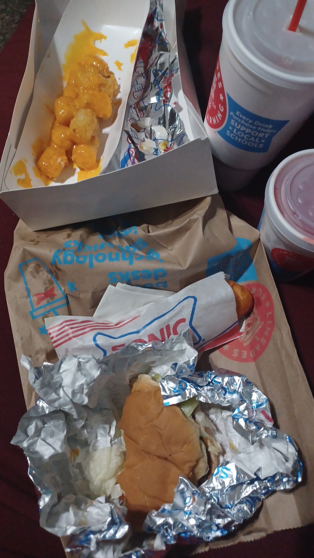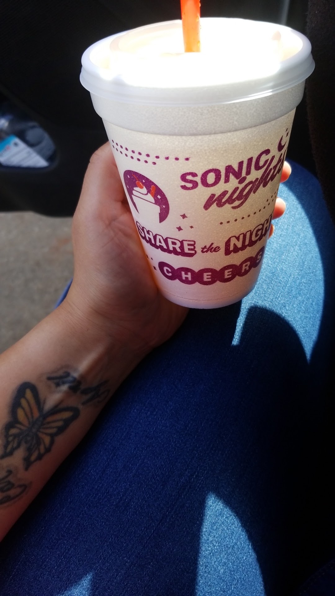 When greeted at the Drive-Thru the young lady seemed pleasant enough. We had asked for a few moments and were granted all but 30 seconds before the same young lady chimed in, sounding exasperated, "Do you need any help of have any questions or something??". We again asked for a few moments and heard her audibly sigh. When we had figured out our order: Large grape amd strawberry slush, Medium oreo dark chocolate concrete with Heath, Grilled chicken wrap with no tomato, Two large popcorn chicken, And a sonic ultimate meat and cheese buritto. She seemed either totally new or that she honestly didnt want to work. We got our slush, the lid wasnt even on. We got our concrete, wasnt mixed at all with vanilla at the bottom 2 inches, no Heath, and thick oily taste. Disgusting. Our two orders of popcorn chicken were rock solid, salty, cold, and not even in the correct containers. The breakfast burrito we received was about 2 inches around, half the size of what is normally received, oily and otherwise discusting. The chicken wrap that we had gotten had tomatos, was falling apart due to some of the tortilla was hard and other parts soggy due to it being totally soaked with Ranch. This place is absolutely trash. You are better off going anywhere in the...