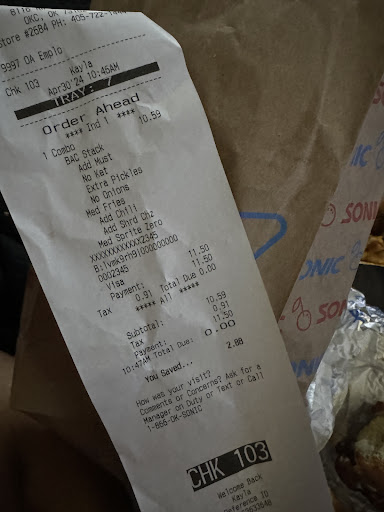 Read moreAfter frequenting this Sonic for a while, I think today was the last. I’d recommend taking the few extra minutes to go to any other Sonic nearby rather than stopping at this one. Carhops often seem annoyed. Orders take forever (I’ve waited upwards of ten minutes for one drink). 50/50 chance you’ll get the sauce you ordered. Don’t expect any modifications on your order to be present. I ordered two sandwiches, a jr chicken sandwich and a cheeseburger. I asked for no tomato on the burger. Upon opening both sandwiches, I found that not only did the burger still have tomatoes, but they also put tomatoes on the chicken sandwich. The chicken sandwhich doesn’t even come with tomatoes, so I have no doubt that it was intentional. And the most egregious of all, be wary if you’re paying in cash. Multiple times I’ve been shorted on change, probably the carhops giving themself a tip. Make sure you count what...