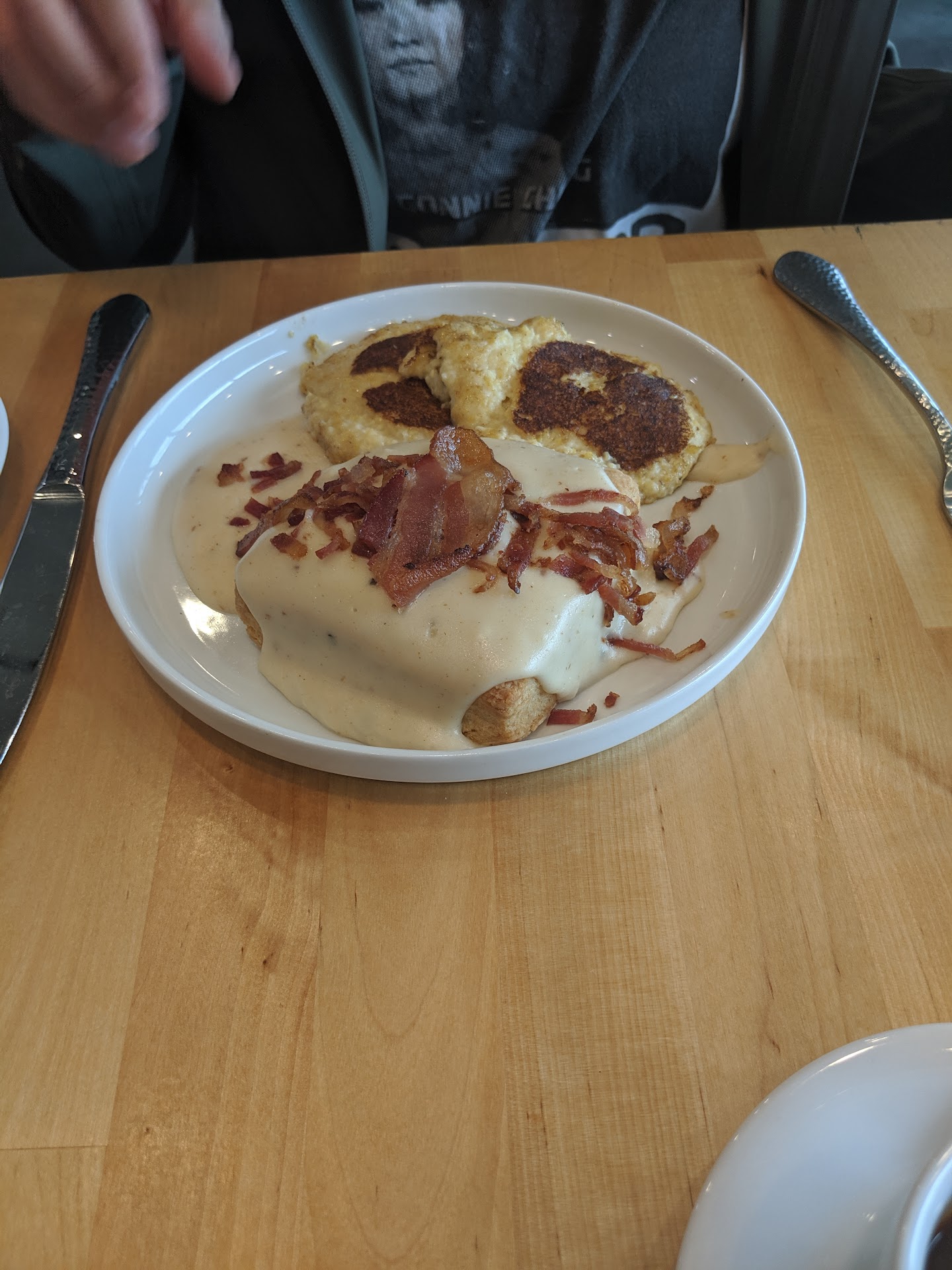 We then ordered and after a lengthy wait, our food arrived. The bagel sandwich had generous portions, but featured an odd decision to combine the flavors of an herbed cream cheese with maple bacon. The polenta was way too acidic. It was inedible. The Biscuit and Gravy was just a biscuit and gravy with some broken bacon on top. The one highlight was the hash brown side, which was notable for just being completely normal.