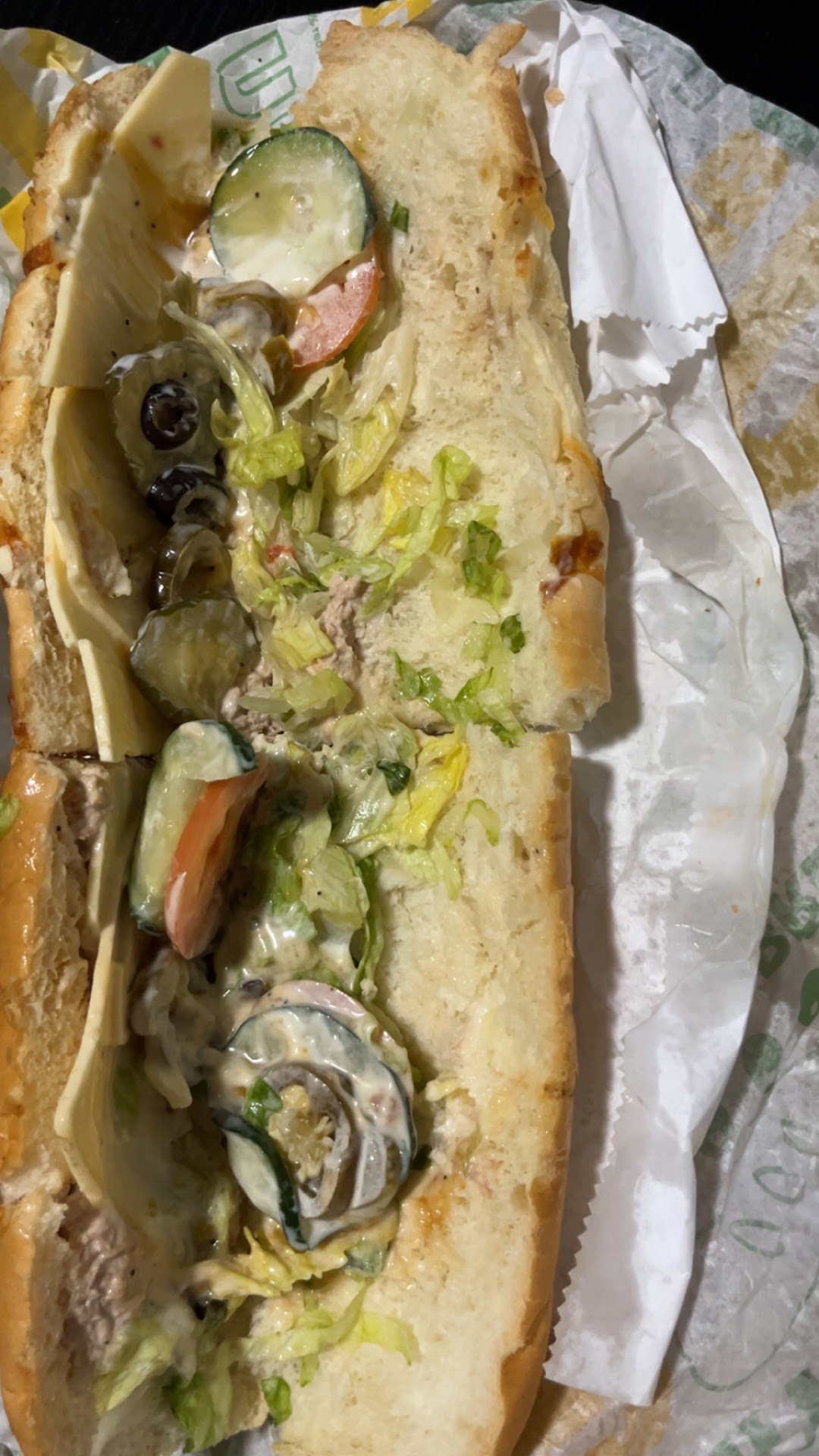 Awkward experience period. Three people there but my sandwich was not assembled correctly at all the way subway makes sandwiches & they don't speak enough English. I let them toast my tuna because I don't like wasting food but I don't know anyone who likes heated tuna. I asked for wheat bread and provolone and toast it and waited, but before I knew it he put tuna on it first and then he put provolone on top of the tuna so I let him toast it. Then he put some spinach and I stopped him and said I forgot I want ranch dressing on it, but he kept putting on the spinach first and then put the ranch dressing on it. One woman offered to remake it but I don't waste food. Then I forgot I wanted it cut in thirds and told them but she said it was already cut in two. I gave up and asked for a plastic knife before I paid and sat down. The sandwich was not even cut all the way through! They kept speaking a foreign language I don't know the whole time I was eating, which most people find annoying. I thought they spoke Urdu maybe but he said no when I asked him but he didn't offer to tell me what language they spoke. After I got out the door he yelled I love you. I don't know if he was being sarcastic or nice. I'm not going back. Music playing was...