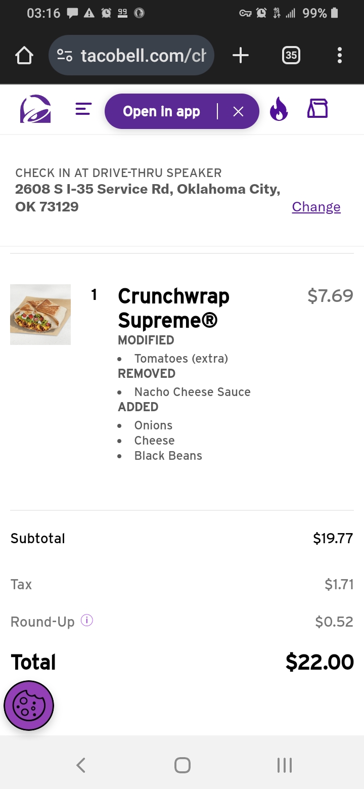 Read moreHow amazing that my phone lets me know after a trip home from the nearby Taco Bell that there were some people dissatisfied as well as I with my experience at the Taco Bell drive-thru I don't know who these other people are but I will testify that I sat in the drive thru of only 5 cars from front to back with no other vehicles approaching and the front vehicle set there for 20 minutes then I sat there another 10 minutes to reach my turn turned my car off three times and the lady at the service window seemed dead and boring with absolutely no expression of remorse to my patience with the look like say one word I politely took my food got my change and concluded when I got home I was making a dissatisfaction call and to my surprise I see others were dissatisfied something...