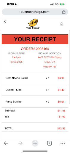 Read moreI love Taco Bueno, the food is usually the best for fast taco joint. However this location was way below par. The staff were unprofessional in both appearance and attitude. The food was cold and the ingredients were skimmed. The burrito was half filled and the taco salad was missing half the ingredients. The cashier rang me up for the wrong food and I went to return it and they told me after taking my food that I would have to pay for the proper food. After I said that was not right and told them my experience was below par they went and replaced it without charging me. This location was very disgusting. We visited at 11:00 a.m. on August 4th 2021. All of the tables were dirty and the floors were dirty. Both my wife and I use the restrooms and they too were filthy. The men's room the paper towel dispenser did not work. There was a foul odor inside the dining room. We accidentally spilled our drink and they had no napkins to clean the table and did not offer a mop to clean up the mess. We left and sat in the parking lot and watched to see if they were going to clean it. After 30 minutes we left and they have not yet cleaned it. We understand that they may have been short-staffed however that is no excuse. Cleanliness is a priority above all. The salsa bar was closed. They did not offer any salsa at the...