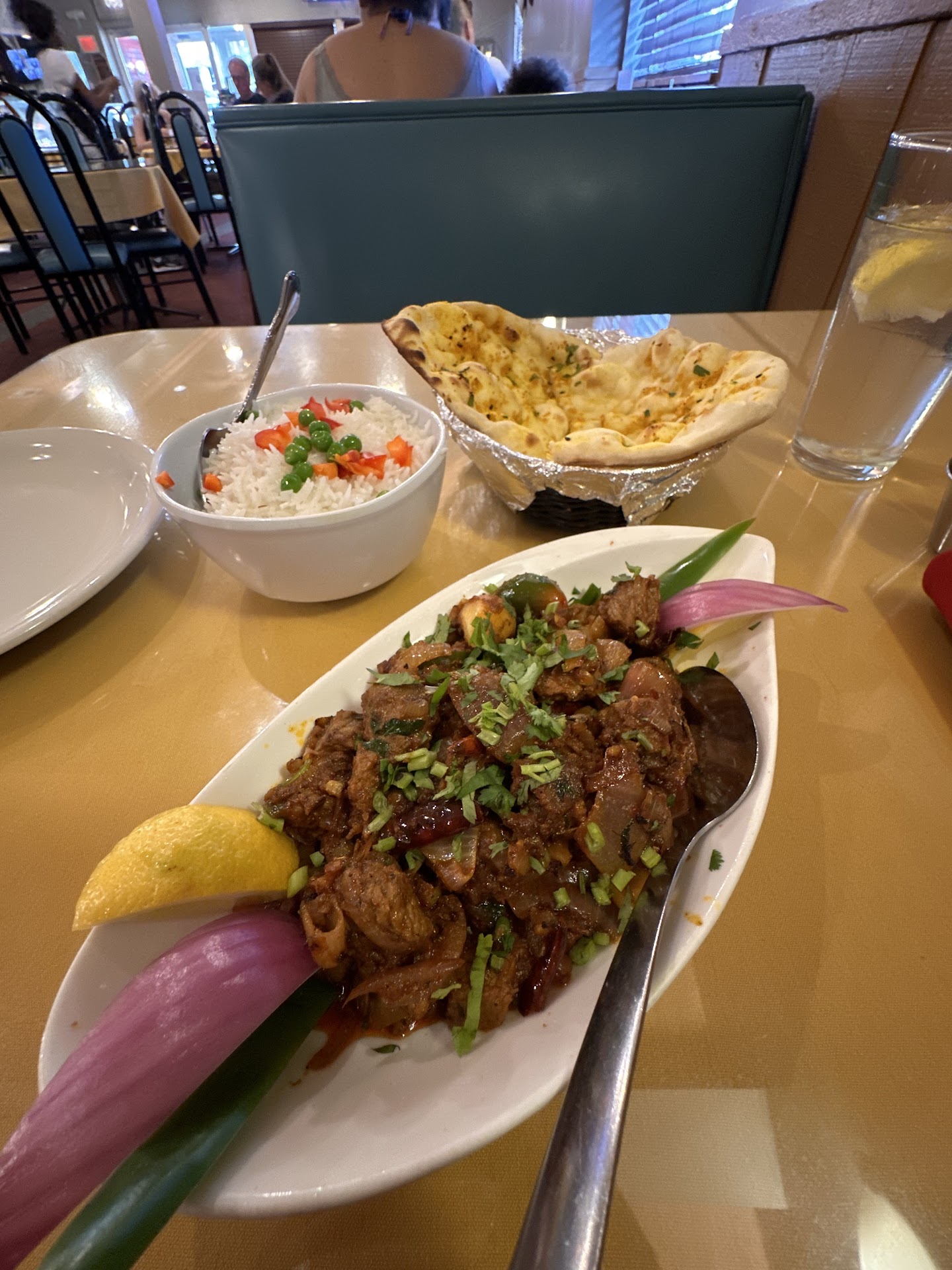 I thoroughly enjoyed the food here! I didn't think I would, but it was seriously delicious Indian food!! Anytime you go to a buffet, you're taking a risk. While I did do the buffet in order to try as much as I could, they do offer a full menu to choose from. I will start by saying that the goat curry was my favorite dish of the day! The flavor was complex and delicious. The chili chicken was also a fantastic dish. They also had this cabbage dish with coconut that made my insides so happy! This place has a phenomenal way of dialing down the natural sweetness using savory notes that made it hard to stop eating! This leads me to dessert (the only plate of food I took a picture of). I had the saffron and coriander soaked cake balls, which had a wonderful flavor and the texture of French toast that was slightly undercooked. Next was a pineapple and cream-of-wheat pudding cake thing that was so effing tasty it was stupid (I ate 3 portions...) Last on the plate was a mango and apple custard, which was not my thing, but my wife loved and went back for more. This place is definitely worth trying if you have an adventurous palate. I wish the spice was stronger across the board, but I'm guessing it's tamped down to accommodate a wider range of patrons. That being said, if you order off the menu, you can order the...