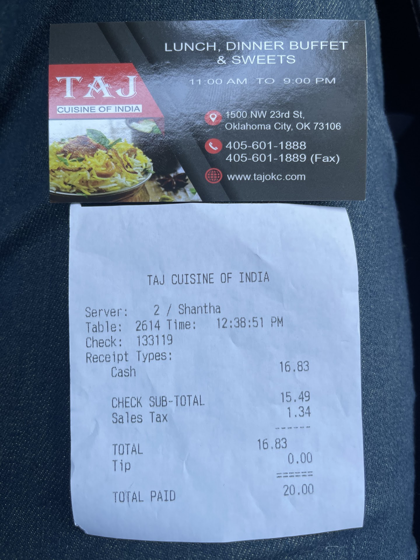 Read moreDon't be fooled by the exterior or the interior the food is wonderful! I don't know what type of restaruant it used to be, but it's an old building. The family has painted and fixed up the place, but it seems a bit tired sometimes. It's clean and it's a busy place. They have won best Indian Food in OKC several years running so they are doing things right. They have a buffet available as well as a menu you can order from. They also have a to go special that I wish all buffets would adopt. They don't charge you by the pound they have to options. 2 proteins and 3 sides for under $10 and 1 protein and 3 sides for under $10. They will fill your to go box with your choices and the two of you go around the buffet. They seem to have a lot of Door Dash customers as the pickup area always has sacks ready for the drivers to deliver. They have standards on the buffet, but sometimes will put something out that I've not tried or heard of and it's never disappointing. The service is quick, efficient and very friendly. There is a banquet room for parties available. They do have a couple of TV's, but don't expect sports, news or cooking shows. You're going to get Mr. Bean on one and gospel music on the other. They sound is turned down low so neither...