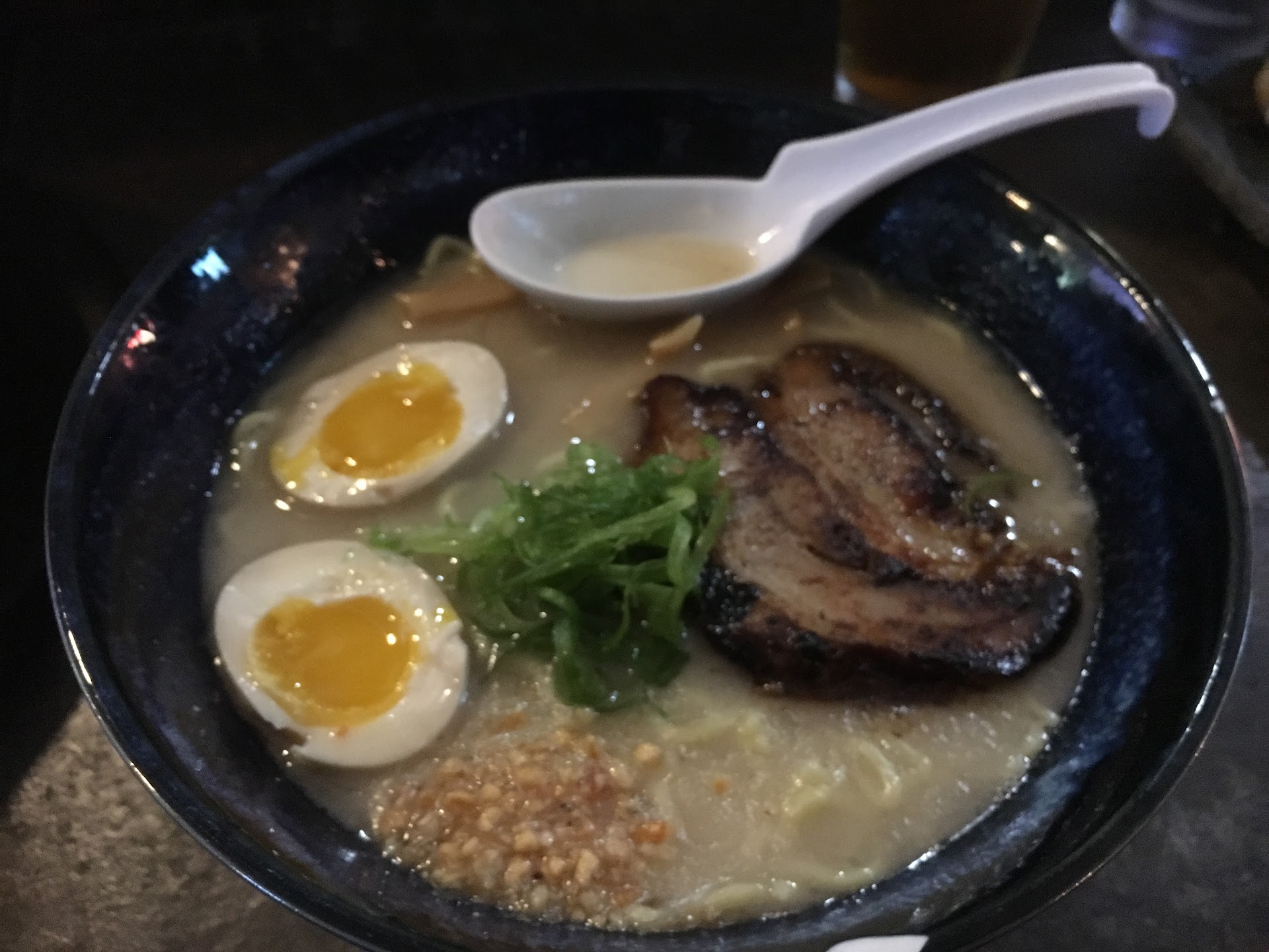 I sampled the Ninniku (Garlic) Tonkotsy Ramen. The garlics blended well, I'm not a lover of Chashu (pork belly), but it tasted good. The Negi (green onion) was whole not chopped which may be a different experience. The Menma (chopped bamboo) was my favorite part, they absorbed all the juices and flavors and actually were a very enjoyable part of the dish. I was not a huge fan of the Nitamago (seasoned soft-boiled eggs), personal preference. I noticed after my dish was cooling for a little that the fat began to solidify at the top, very fatty dish!