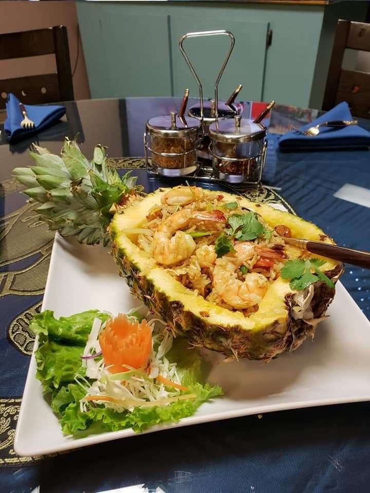 As for the food, you've just got to go and try it. I promise there's something for everyone on their menu. I love spice, so their green curry or any noodle dish at spice level 4-5 is perfect for me. If you're not into heat, ask for level 0. If you want steak, get the royal pad Thai. Meats not your thing they have dozens of vegetarian options. You can also take any dish and add all the meat you want (the cost is minimal). They also have delicious soup options (Tom Yum is my favorite). The pineapple fried rice is out of this world, and it's literally served in the pineapple! If you go, you also HAVE to try the money bags!! Imagine Thai dumpling filling, mostly meat, shaped like a tied up bag of money from a bank and fried in the crispiest wrapper you'll ever taste (that's not an exaggeration). If you enjoy Asian food as much as I do, then none of this is new for you, but if you're someone who might steer away from these cuisines because you're not sure how/what you should eat then you should really try this place. The staff are all super friendly and always eager to help new patrons discover their hidden love...