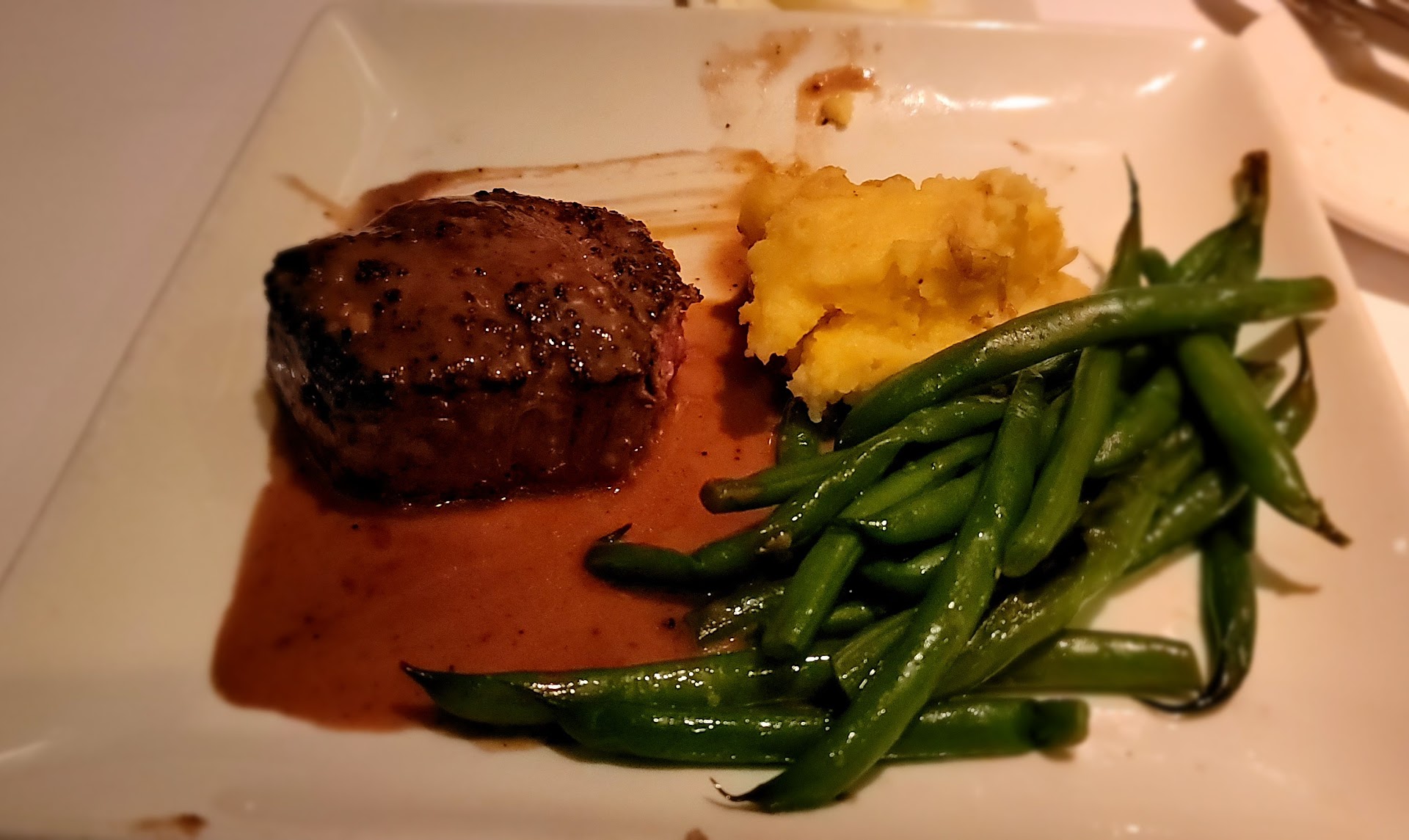The lights are slightly dimmed and the music is relaxing jazz. The service is impeccable and it is an easy place to be romantic. The food. Where do I start? Everything we touched was over the top delicious. The spinach salad with the candied onions was sure to light up anybody's taste buds. I had the 8 oz filet au poivre and it came with red mashed potatoes skins on and green beans. The filet was amazing, and hard to beat anyplace else in town.