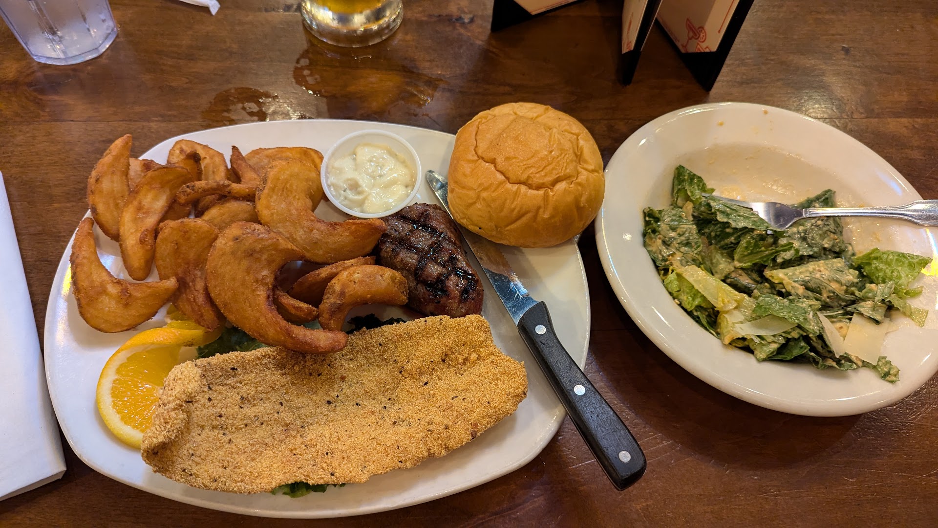 Now, the country fried steak. Let me tell you it's very clear it's homemade from a ribeye. If there was even a doubt, the bit of fat on the steak enforced it was a real ribeye! It was really good, but I can't say it was the best I ever had. The garlic mashed potatoes were a little over powering with the garlic, which is why its 4 stars.
