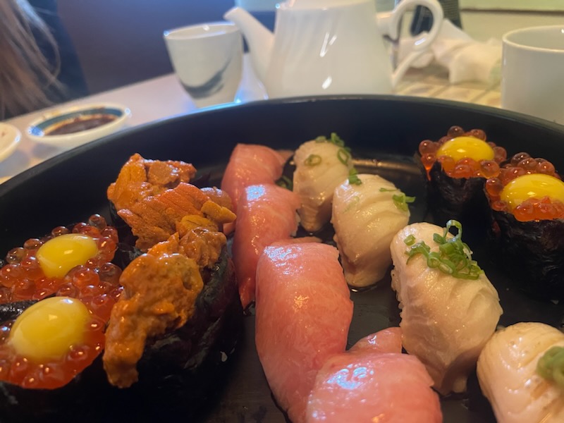 We have a usual there; salmon kama, chumaki roll, omakase boat, and it is a beautiful mix of grilled fish, cooked fish, and raw fish.