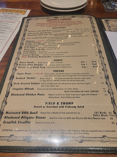 Read moreMy wife and I had been here once before awhile back because she really wanted alligator. So, we came back. I wasn't enthusiastic about it as the prices are steep and I felt the food was very, ok. Let me tell you they doubled down on ensuring they'll not get a visit from me again. Food was quite sub-par for price point.. would be considered o-k if several dollars cheaper per plate, it's not. Service was horrendous. Waitress told us to put the dirty dishes on the edge of the table (appetizers and salads, etc) and she would be right back to get them. That never happened. Instead my wife ate with them crowding her space the entire time, thinking surely she'll be back to check on us, follow through, offer more bread, get refills. Nope, none of that either. Waitress upsold my son and I on a side salad add on for .99¢. nope got charged $2.50 each additionally. Had to wait around quite awhile to sort that out with the manager. The fried alligator was enjoyed by the table, but it didn't exactly come with much. Maybe during a happy hour or lunch special it would be closer to ok? My wife got the Trappers Catch, said the tilapia was surprisingly better than she anticipated but was quite disappointed that when it said "topped with shrimp and scallops", that it was going to mean two small shrimp and one small scallop. Her steamed broccoli seemed like maybe it was steamed earlier in the day? 🫤 My son got the Pasta Diablo, he said he really enjoyed it and had some kick, but he's also 1# and just an appreciative kid. I got the Cajun pasta, and wasn't impressed, especially not for the $19 price point. Still unsure why the quality was poor and service worse when it was 3pm on a Saturday and only a handful of tables occupied. Weird flex to brag about "our ranch is made in house", but then everything tastes like it was poured from a bag, can, or box. But, hey! They've got some cool taxidermy pieces...