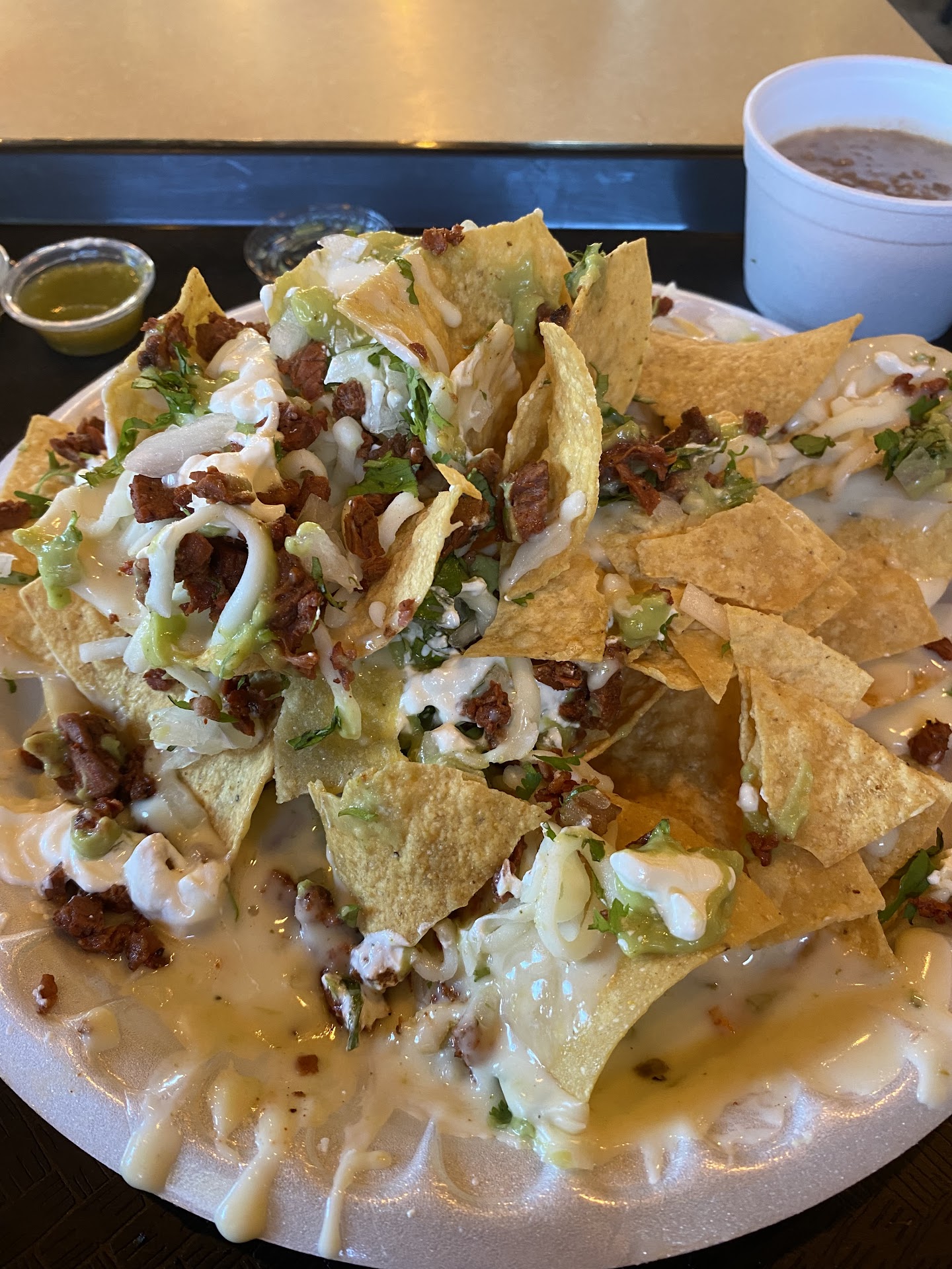 I ordered the loaded nachos for $9.00. I picked asada for the meat option. It was supposed to have guacamole spread, sour cream, cheese, blanco queso and spicy beans, cilantro and onions.