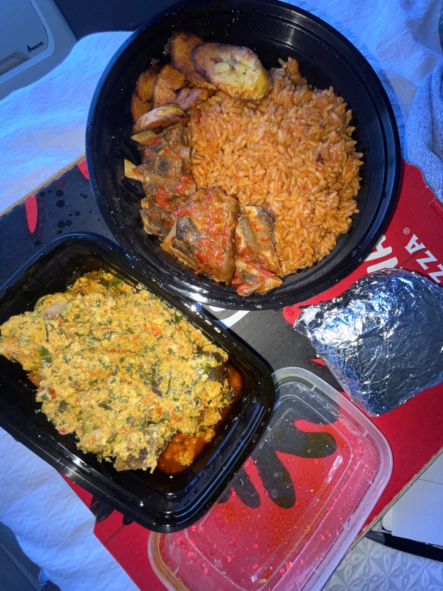 The food was not it. Okra stew was excruciatingly spicy I couldnāt even take a full bite. The yam was not great. The stew with the chicken was so oily they might as well have given us a bottle of oil. You canāt substitute any items. A side of jollof rice is $12.