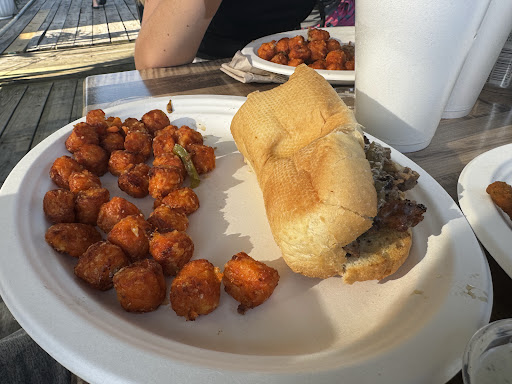 I Went Here with my family & had concerns with the menu because it all sounded strange to me. When I arrived I was absolutely blown away with how Delicious this food truly was! I had the Low Country with Fried Green Beans & it was absolute heaven in my mouth! I also got to try some of the sweet tater tots & they too were delicious! My recommendation is to not go in with “will this taste good” because ALL of it taste good! This restaurant is more of a bar than a restaurant with paper plates & styrofoam cups, but the food absolutely does not disappoint! You get to sit outside on a dock & the environment feels very relaxing/ outdoorsy. they were slightly busy while we were there so getting our food seemed to take longer than most places during busy times, but our waitress Kimberlynn was absolutely incredible! She was very sweet & made sure we had drinks filled & apologized for the food taking awhile. I would have gave 5 stars but the paper plates & styrofoam cups gave it a cheap vibe & I found myself struggling to keep them on the table when it got windy. But as far as drinks & food goes: this place is a 10/10!...