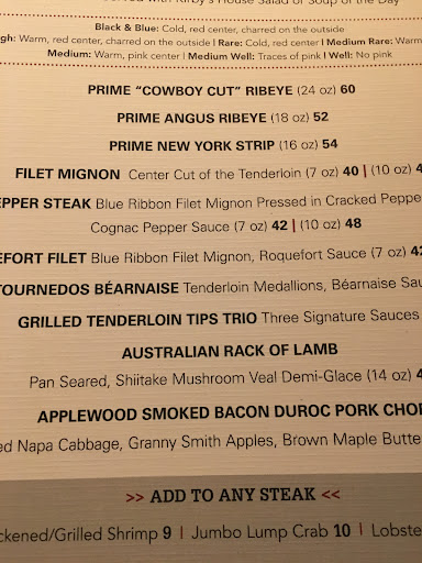 I had trouble making an online reservation for one through opentable, and I was extremely frustrated until I called the restaurant a week prior to my visit on November 24, 2019. I don’t remember the name of the person I spoke to, but they were more than friendly and helped me secure my solo reservation without any problems. I would put this issue on the opentable affiliate, not the restaurant, but truly, Kirby’s, it would be wonderful if the AI interfaces your restaurant collaborates with were as welcoming to single people with disposable income as your employees are. I only called the restaurant because I’m still old-school enough to know my phone has call functions. Otherwise, I would have given up and you would have lost a single customer who has no issue spending over $100 on her own dinner. Caelin, my server, gets five stars. She took fantastic care of me. I pointed out a specific food allergy I have and she made note of it and said she would make sure the kitchen knew as well for each item I ordered. The Premium Manhattan was so delicious, I had two. It’s hard to find someone who can make this classic, simple cocktail. If one is too heavy-handed with the vermouth, the entire drink is a train wreck. This was not the case, and I was pleasantly impressed. I enjoyed the crab cake appetizer (a smidge heavy on the mayonnaise) and the bread course was simple but sufficient. The house salad was a little underwhelming, but the Caesar dressing I opted for was very delicious. My main course, the special tournedos in red wine reduction with king crab was cooked to perfection. I ordered the Brussels sprouts on the side, and the only thing I could “complain” about was the portion size was far too much for one person. I was too full for dessert and left quite a bit on the table. What stops me from giving Kirby’s five stars, though, is the behavior I witnessed from a server named Cameron. At one point in the evening, he got in the face of my server and snapped at her (in front of a full dining room) for not delivering a drink to one of his tables. Several other times during my meal, I watched him speak gruffly to other waitstaff, physically cut them off while coming and going from the kitchen... basically, he seemed to create this air that he was not only more important than any one of them... he was better than them as well. This behavior cheapened the smile he put on for his tables. Now, perhaps he’s the “lead” server in the establishment. Bully for him. That’s absolutely NO reason to behave that way, not in front of paying customers, not even in the kitchen, behind closed doors. Someone needs to have a talk with Mr. Cameron about treating others as you would have them treat you. Particularly if his behavior has a direct correlation to how customers (even those who never have direct contact with him) rate the overall experience of dining at Kirby’s.