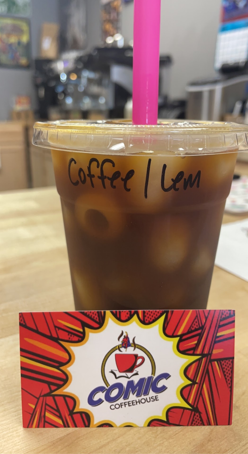 Ā Ā Ā Read moreVisited Comic Coffeehouse with my sister. Right off the bat Mike welcomes you in, the vibe is relaxed, vibrant colors and comics strung on the wall. The menu has familiar drinks like lattes, macchiatos and smoothies. And then thereās Coffee Lemonadeā¦which is exactly that and let me tell you, we weāre pleasantly surprised. If you donāt like the taste of black coffee this may not be the drink for you. We enjoyed it very much. I had an iced chai while we sat a chatted with Mike. To go I had a lavender lemonade. There was also this awesome almond pastry. A cross between a croissant and gooey butter cake. I ate it before I even thought of taking a pic. Definitely coming back. I got my first stamp on a loyalty card, come in...