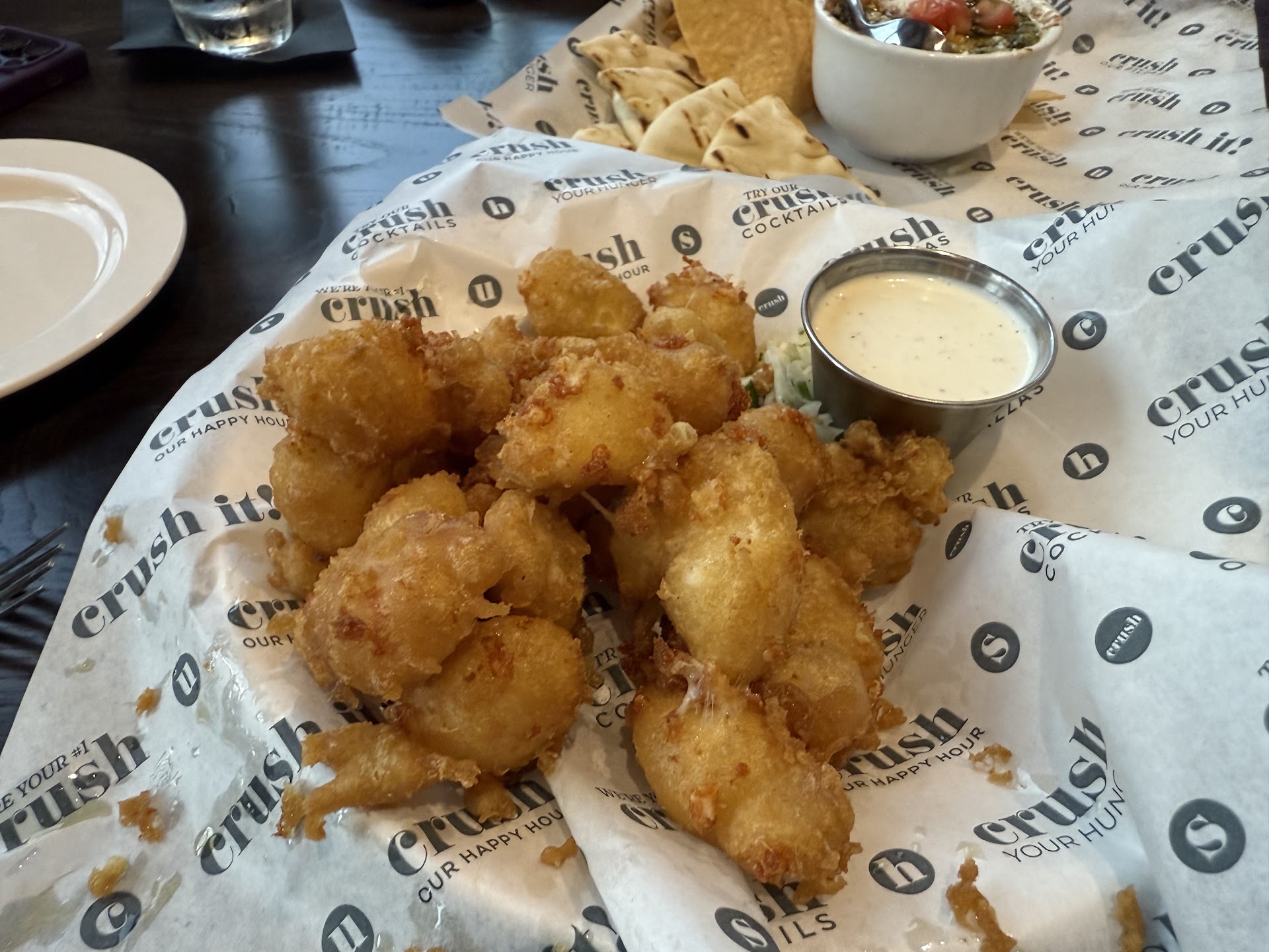 Read moreWe started with cheese curds and spinach artichoke dip. The dip was amazing. The cheese curds were very good, but they were a little greasy and my wife felt they tasted a little like fish (like they were cooked in the same oil as the fish). We got a salad, and that was my only complaint: all of their dressings are creamy. I don't like ranch and I don't want Ceasar on a non-Ceasar salad, sai I got their chipotle honey mustard. It was extremely spicy for a honey mustard dressing. They really need a light Italian or vinaigrette.