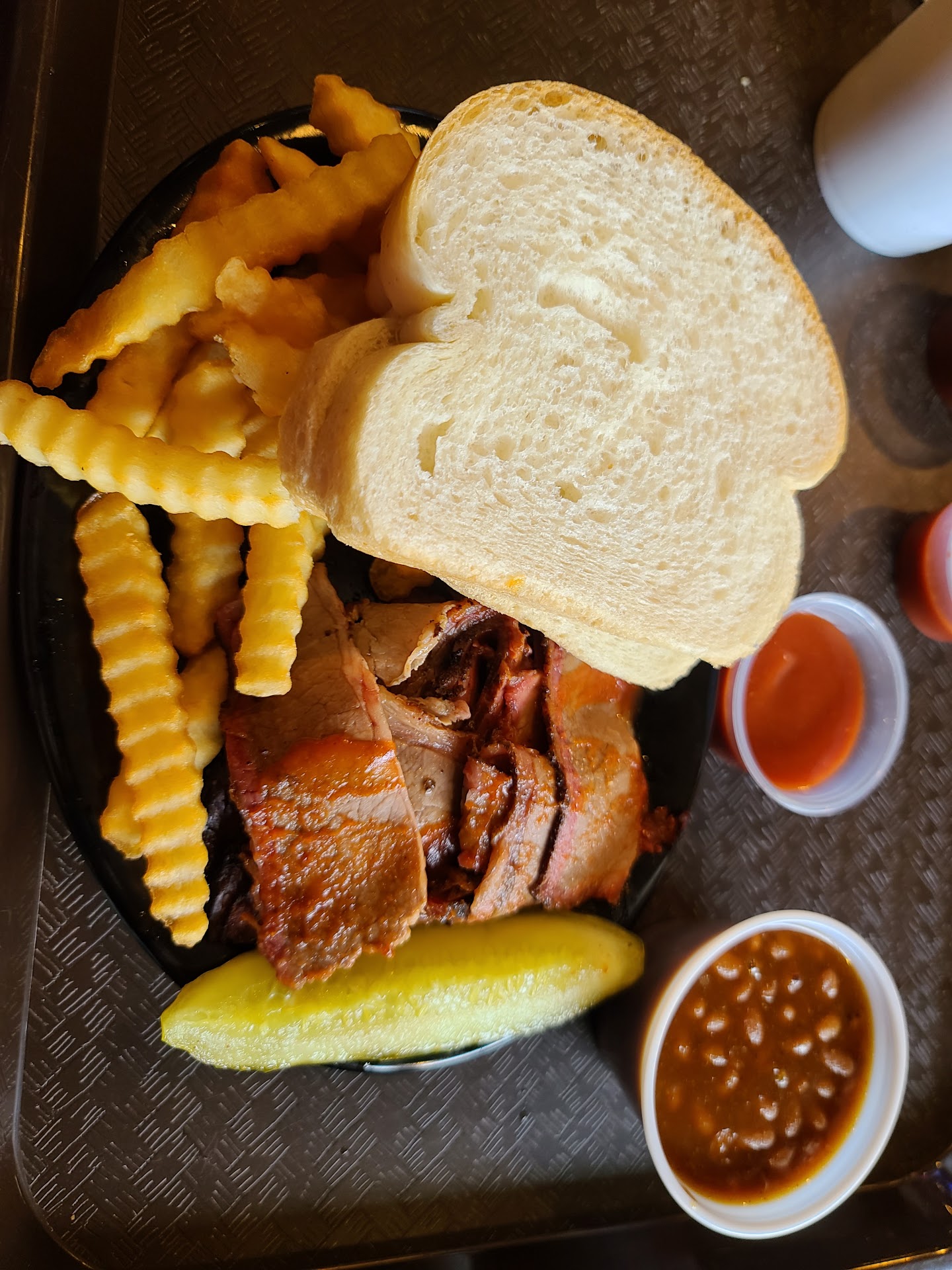 They have the usual bbq joint offerings on the menu with a decent selection of meats and sides. Prices are also typical for a BBQ place. They also offer daily specials for those looking to save a buck or two on their favorite meal. I had the smoked turkey sandwich. It was smoked very well and had great flavor. Fries were fresh and crispy, although I wish I had tried the seasoned fries as those are usually my go to anytime they are offered at a place. The house bbq sauce is in typical Kansas City style with a nice sweet taste with a hint of smoke flavor. I am a big fan of hot bbq sauces because I like to sweat when I eat my bbq! Their house "spicy" sauce wasn't too hot or overbearing. I do prefer it to be a bit spicier, but I would guess that it would be enough for most people and the flavor was good. Free refills on fountain drinks as well, although you have to go to the front register to get it refilled. I'm not a big fan of this because you typically have to wait for the employee to be finished with what they are doing before they can help and it's a bit awkward to cut everyone in line for you to be helped next. I may be weird with my thinking on this, but I would rather get my own drink from a fountain in the dining room. But that is my ONLY complaint with this place...if you can even call that a complaint!