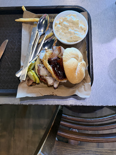 Orders a $10 sliced brisket sandwich which didn’t come with a side. Now I see why customers order kids meals. I don’t know why they call it sliced since it’s deli shaved and has no real texture difference than chopped beef. It’s a way to hide poorly cooked and tough meat. And if you’re a true bbq place, don’t take liberties by saucing other peoples meat. D Brisket requires much more skill than pork and is why they slice the pork properly. But not the brisket.