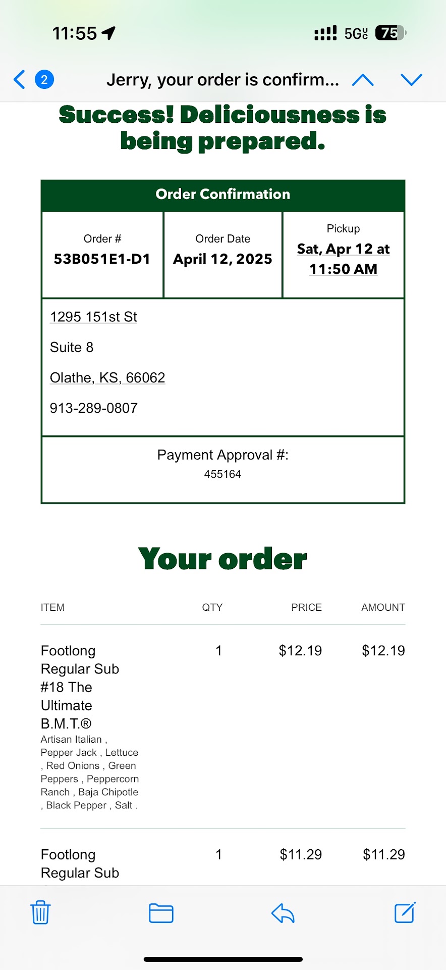 Google Review for Subway – 1295 151st St, Suite 8, Olathe, KS