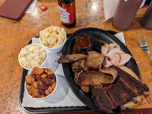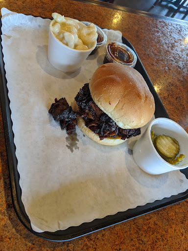 This is about the 53rd BBQ place on our BBQ tour. We had a burnt end sandwich with the mac and cheese as a side. The burnt ends were crispy, which I prefer, but also they were dry. They were slightly sauced before-hand, we added more sauce. The cheese sauce is a white sauce. The pasta was over-cooked so it was a little too soft.