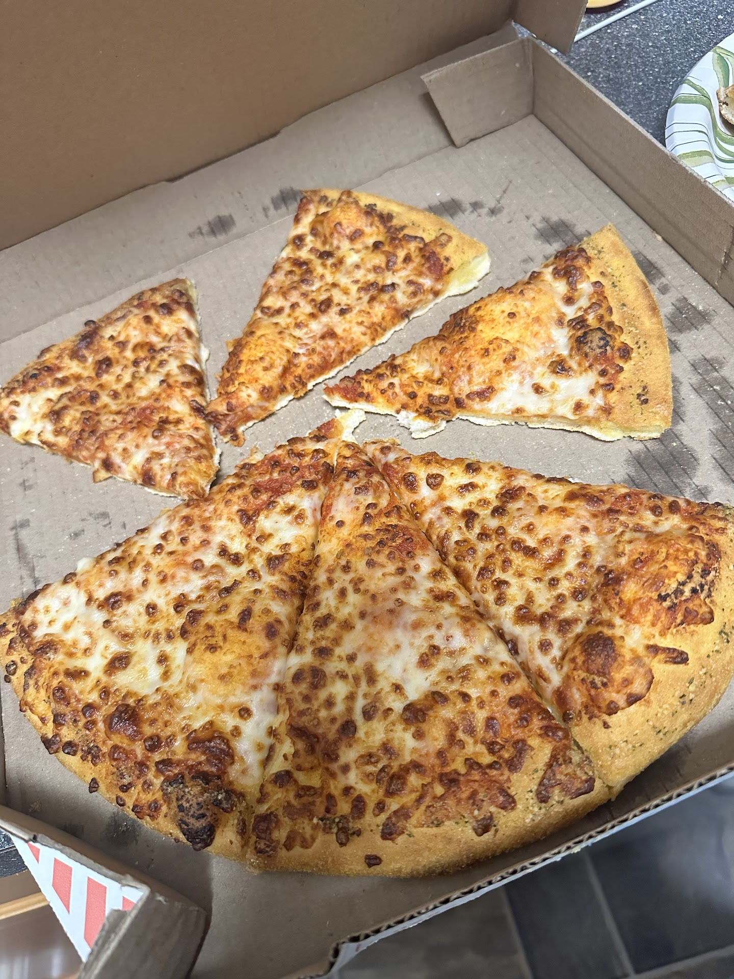 • I ordered a plain (light) sauce and stuffed cheesy bread. The pizza was over cooked and dry. I ordered with no garlic on the crust and it still had that on it. The cheesy bread was better but still on the over cooked side and didn’t seem like it was cheese stuffed.