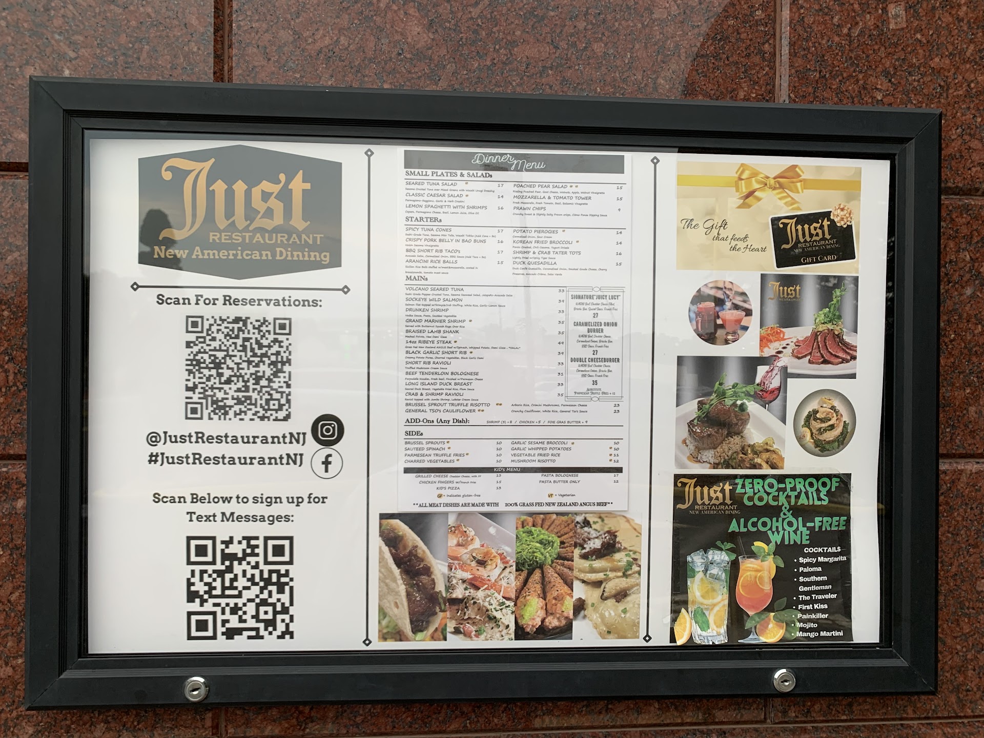 Read moreOnce you get over the location of this fine dinning restaurant (it's behind a BP gas station... so I guess if your car needs a meal, too, it's convenient), the restaurant is very pretty inside and has a nightclub like feel. In fact, one criticism up front? When we go out to dinner, we do not want disco-style "current" music BLASTING from the speakers overhead. That was the SECOND thing about the environment we noticed. That said? Since the ban on mask wearing has been lifted, we've been venturing out again to our favorite restaurents. JUST was my wife's first choice for her birthday dinner. We've always had good meals here, even since they limited their menu a bit. We ate there with friends a month ago, and I had the tuna, which was superb, truly. Everything, including the drinks, were superb. I'm sorry to say, this particular meal was distrubingly bad. I'll say one thing up front: any time a chef has to SMOTHER a dish with SWEET GOOEY SAUCES, you're probably in for trouble. Let's talk about their Pretzel bread. It was probably from the day before. Tasted stale. Did we eat it? Yes; but we were hungry having not eaten the entire day in anticipation of this "feast". As I stated, we were really hungry and we ate what they served for the most part as we have done many time before. But the appetizers were either FILLED with OVERLY thick and sweet sauces - hiding the flavor of the food! We had the short rib tacos. Way too sweet. We also ordered the Fried Broccoli. I couldn't eat more than hlf of one. Disgustingly sweet. We would have been better off telling them to leave off all sauce. My wife ordered the Grand Marinier Shrimp. Inedible! Gross. It's as if they dumped a pound of sugary syrup on top of the dish. She didn't touch her meal and took it home with her to be polite but tossed it as soon as we got home. My son came with us. He had never been to JUST so we were pleased to have him join us. He ordered a medium rare 12 oz steak which was the consistency of rubber. I'm not kidding. It was the worst piece of beef I've ever seen or tasted. It, too, was inedible and? OVER COOKED. We should have sent it back, but we didn't want to kill the celebration buzz. His mashed potatoes were tasty... As to my meal? I ordered the Filet Medallions, which, to the chef's credit, were tender and medium rare, as ordered. That said, it was SMOTHERED in a dark brown SAUCE. SMOTHERED! You couldn't really see the meat which was atop a piece of garlic toast. It, too, was gross. I had to scrape off the gravy where possible, but really? Shameful. The best part of the meal was the pre-ordered Dessert Sampler. That we enjoyed. Our server was lovely and did a solid job. The staff works hard. But for a special occassion, JUST a mistake. Very inconsistent. We will not be back - especially at these prices. I'm sorry, I hate leaving negative reviews. But at the prices we paid for this meal, we...