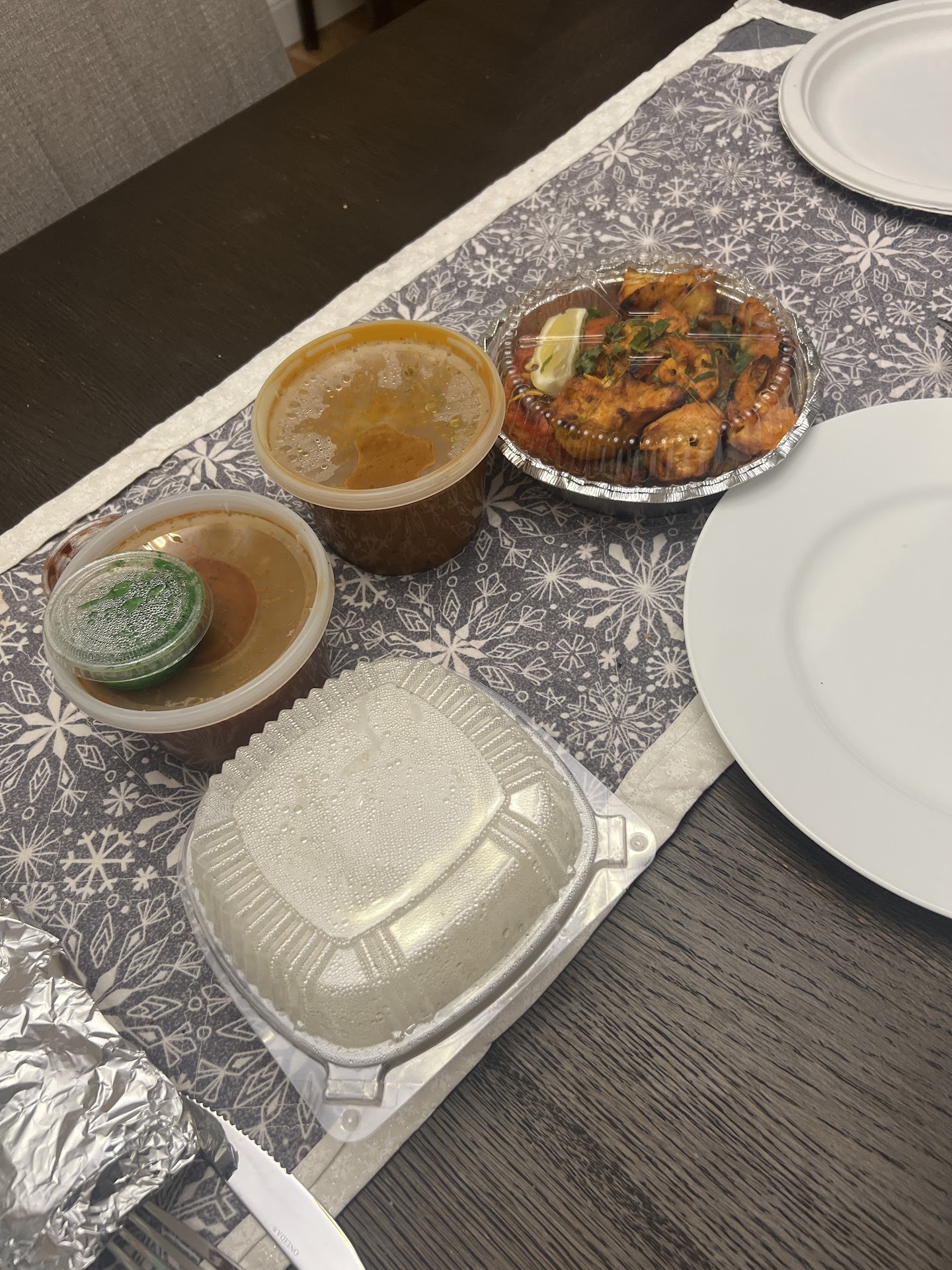 I didn't want to take-out because I wanted to experience the whole shebang. I walked in and the place was dead... I mean empty. It was a little weird. But I walked up to the counter and ordered my food... maybe I should have sat down first? I don't know. No one greeted me until I got to the counter. I don't know very much about Indian food and she asked what I wanted right away. I have no idea what any of this, I told her. So she suggested an appetizer while I looked at the rest and asked what it was. So I settled for the veggie samosas. I know I also like chicken tikka masala so I ordered that with some garlic naan bread to be safe. I sat down at one of the tables and waited for my food. Once my food came out, I was in heaven. It looked delicious and I couldn't wait to chow down. The veggie samosas came with two sauces, a sweet and a hot "green" sauce. I don't know what that is, but it was great mixed with the sweet sauce. Then on to the chicken tikka masala. I got it with medium spice because I don't know how their spice chart works. It was the perfect amount of spice for me and the sauce was rich with flavor. I draped it over some rice and got to business. It was so delicious that I dipped my naan bread into the masala sauce.