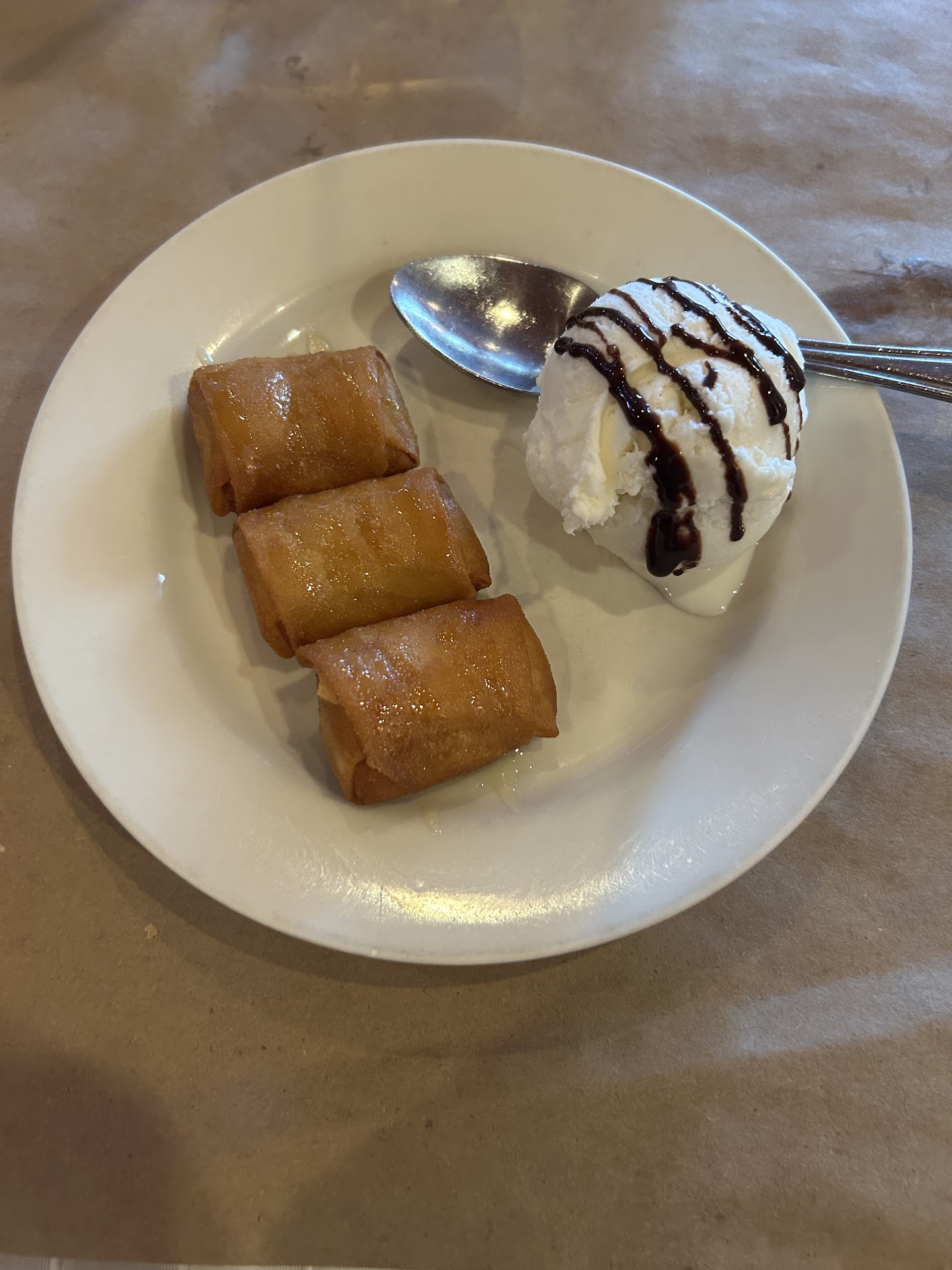 We always start with the veggie spring rolls. They are absolutely delectable. They are always cooked perfectly with a very light and flaky delicate exterior. Other places the wrap is pale, dense, and uninviting. The first bite to the last, they are wonderful. The filling is so perfectly delicate and fresh tasting. Other places its oily and bland. The sauce is so light and subtle we always double dip and are scraping the dish for the last drops. I have always been happy with all the appetizers but we can't help always getting these. The satay was awesome with nice grill marks and bold flavors.