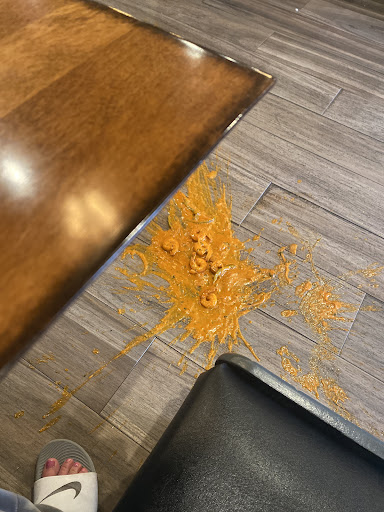 It was an accident, and I understand that. It happens! The waiter said he just wanted to go home. I felt bad for him. He then went to the back, we heard a lot of yelling, and he never came back to clean up the mess. Nor did anyone come back for that matter to clean up the mess. Which was disappointing… My boyfriend had to put napkins down for me to walk over, to get out of the booth. I guess the waiter was having a bad day, as we all have been there. The other worker asked me what happened as the waiter wasn't leaving the back area and "wasn't talking"…