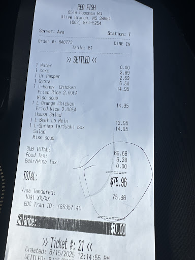 Read moreMy two daughters and I recently dined at Red Fish for the first time. The food was enjoyable, and our server, Ava, provided pleasant and attentive service. Our bill totaled $75.96, and we left a $15 cash tip on the table, clearly noting on the signed receipt (in pink ink) that the tip was left in cash.