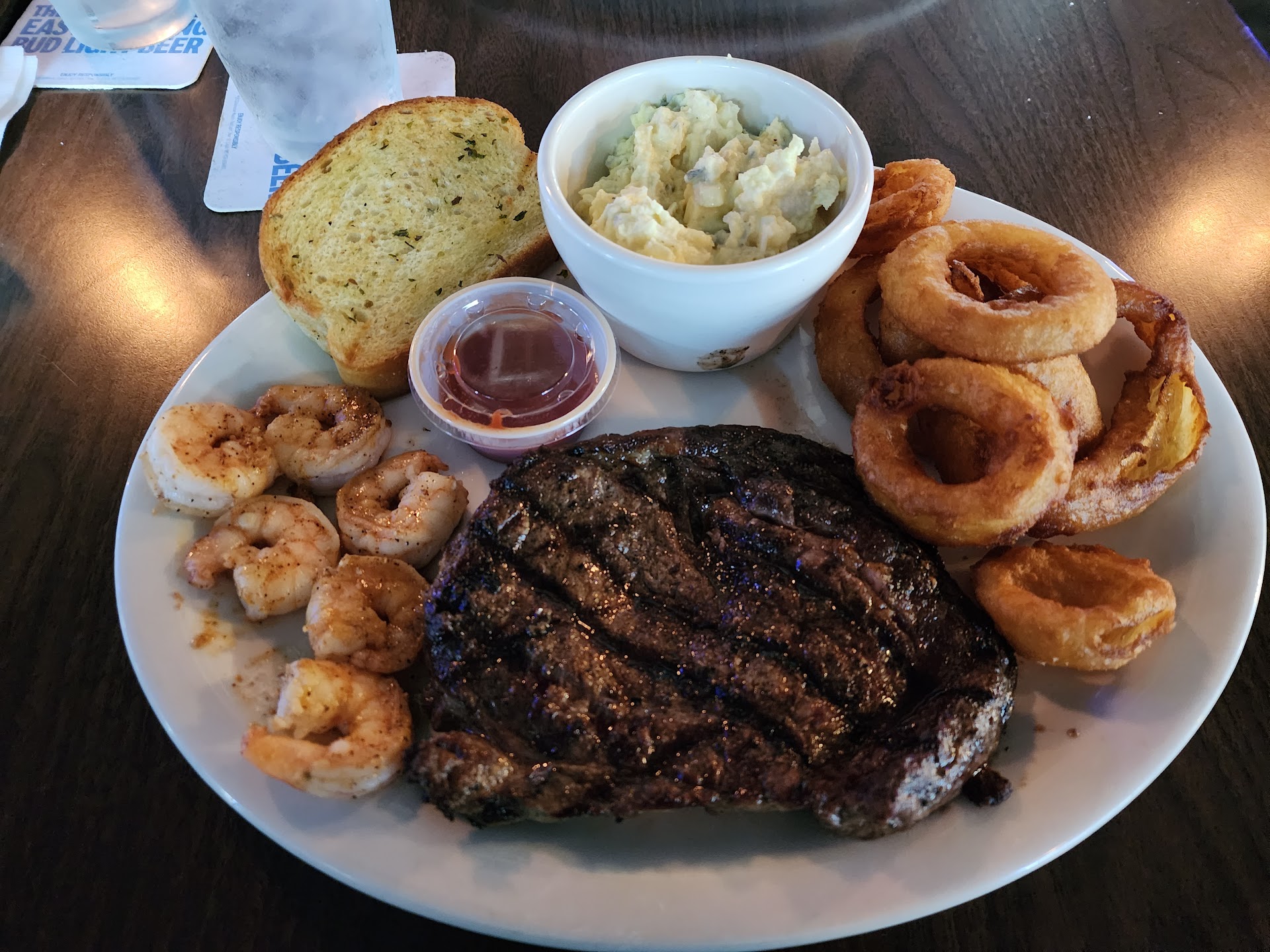 Now by solid meal I don't mean go into a Dennys and order steak and eggs, I mean old fashion sit down, and order something made with a decent level of pride behind whats served. The menu, beit small, was fairly priced. There was a tad concern as an OTR driver about portion size for the price, however much to my suprise, they don't cut corners. I ordered a streak with shrimp, something I don't order often as the steak and shrimp are usually on the the small side yet these were not. In addition to that order, it came with 2 sides, you get to pick, and I had home made onion rings and what also tasted to be home made potato salad. Unless Sysco or Gordon's upped there quality, its definitely home made lol.