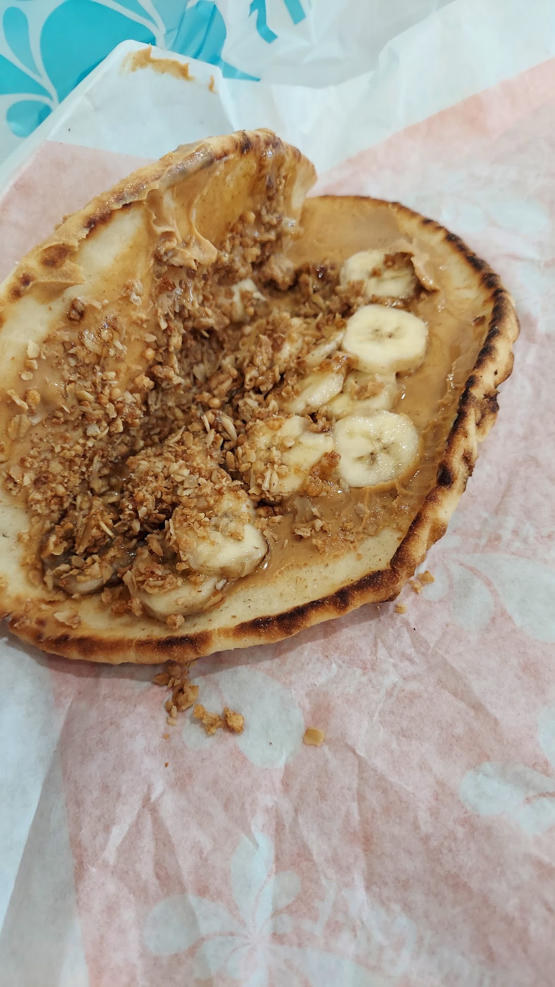 ☆PEANUT BUTTER BANANA CRUNCH FLATBREAD ~ 3-stars peanut butter, banana, granola & honey ••• • This being skillet-fried with a lil' butter is the missing piece! Other than that it was pretty good for the most part.