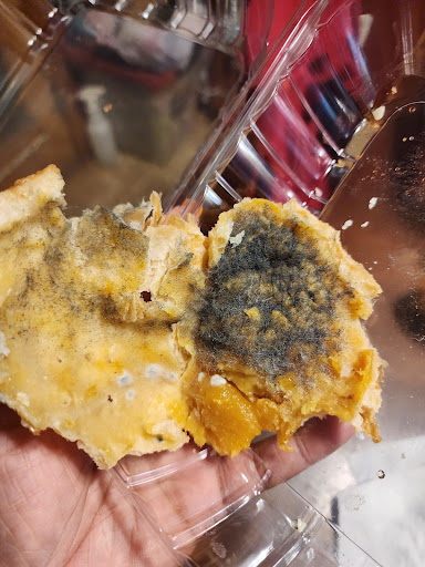 We have frequent customers who typically order upwards of $50-70 worth of food and live over 40 minutes away. On Saturday, June 15th, my mother, niece, and I came to your restaurant and ordered 2 chicken BBQ rice, Lumpias, Fish Balls on a stick, a Ube Cookie, a Cupcake, and a Mango turnover. The employees were friendly but the food did not meet the same standards. You can see why that would be extra disappointing since we are used to having quality food from this establishment. Once I had grabbed the food and sat down to eat, we found that the BBQ chicken wasn’t hot. That didn’t make much of a difference since we understand that we ordered lots of food and it was sitting while the rest cooked. I also realized that we never received the Lumpias and had to request them again. While we waited for the food we decided to eat the Fishballs which were extremely overcooked and rubbery with an almost unchewable first layer so we could not eat them. When they brought them out they included an extra Ube Cheesecake cookie for the forgetting the Lumpias which was appreciated. Before we left my mother ate a few bits of the Mango turnover while I ate the Ube Cupcake. By the time we got back to our side of town, my mother was rushing to the bathroom with a violent stomach ache. While driving back I ate one of the Ube Cookies only to find out that it was completely rubbery and unchewable in the center. I found this out after eating around the outside. But by then my chest and stomach had already begun to have a sharp pain. After a few hours of running to the bathroom when my mother returned home, she wanted a snack, so she was about to heat up the left Mango tart when she noticed something black on the inside. The whole tart was completely covered in black mold from top to bottom. In the included images you can clearly see the disgusting spores and mold spreading through the pastry.