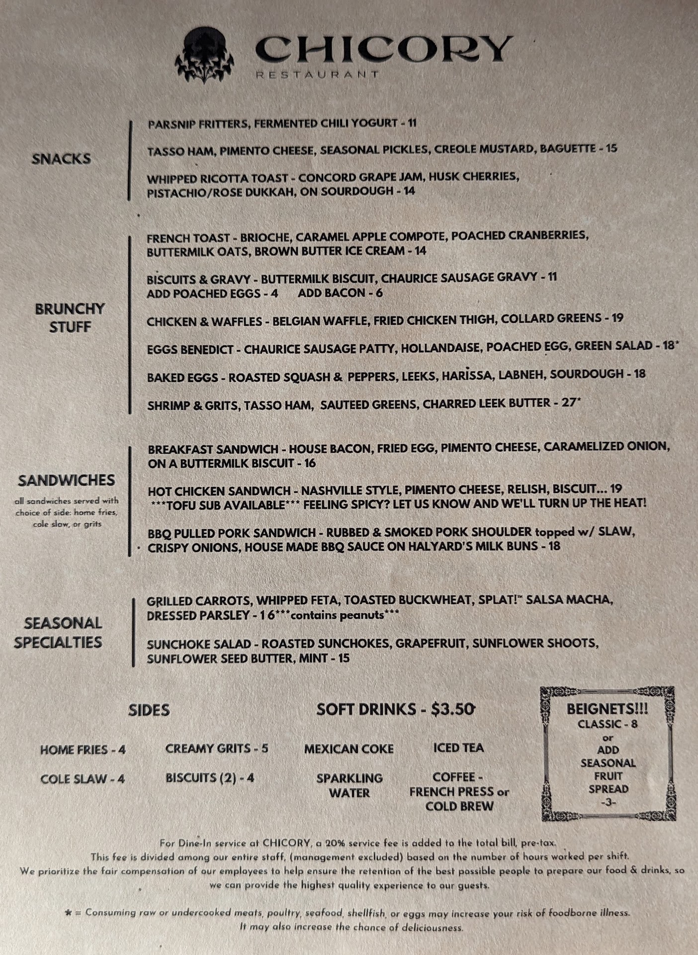 Chicory might be the best restaurant in Olympia. It's unexpected and unpretentious which lend to its appeal but result in a low profile that I'm always hoping doesn't diminish their success. Love the bar styling and bathroom wallpaper heavy with gold accents, and they have what feels like an excellent secret record collection. I appreciate the servers state aloud the 20% gratuity. Since the gratuity addition is standard, I'd love to see them tack it on the menu pricing and brag about paying their employees and refusing tips.