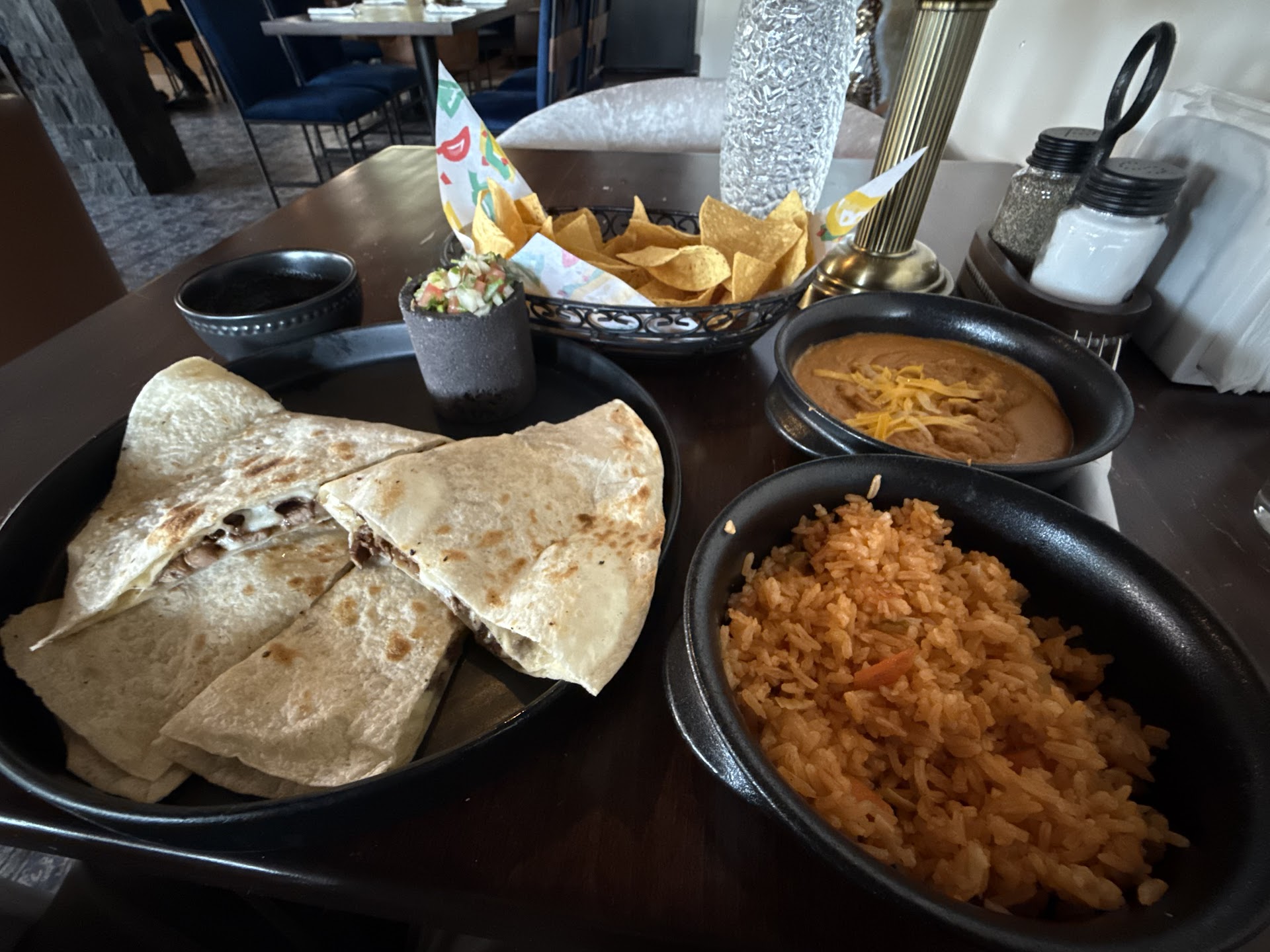 I eventually get my entrĂŠe. Normally, I'm given a huge oval plate with the quesadilla, rice, and beans, all put together on the same plate. Today though, I'm given a circular plate with the quesadilla on it, and the sides are served in bowls separate from one another and separate from my quesadilla. I've never seen that before at any Mexican restaurant ever, but okay.