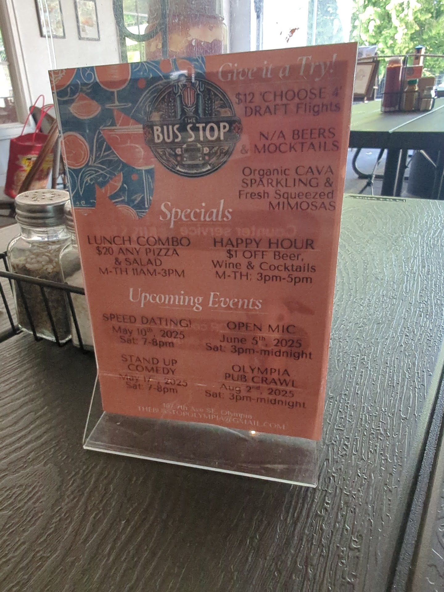 Read moreMy husband and I had a wonderful lunch on our first visit today. They share a space with the Bus Stop cafe which made us some kickin drinks. The Greyhound had great Hawaiian burger and Casadias. Staff warm and welcoming. Cool atmosphere in the old capitol area. Dog friendly but they like Fido and family to dine in the garage area as we did. Fun standing chess area too! We plan on bringing friends! Highly...