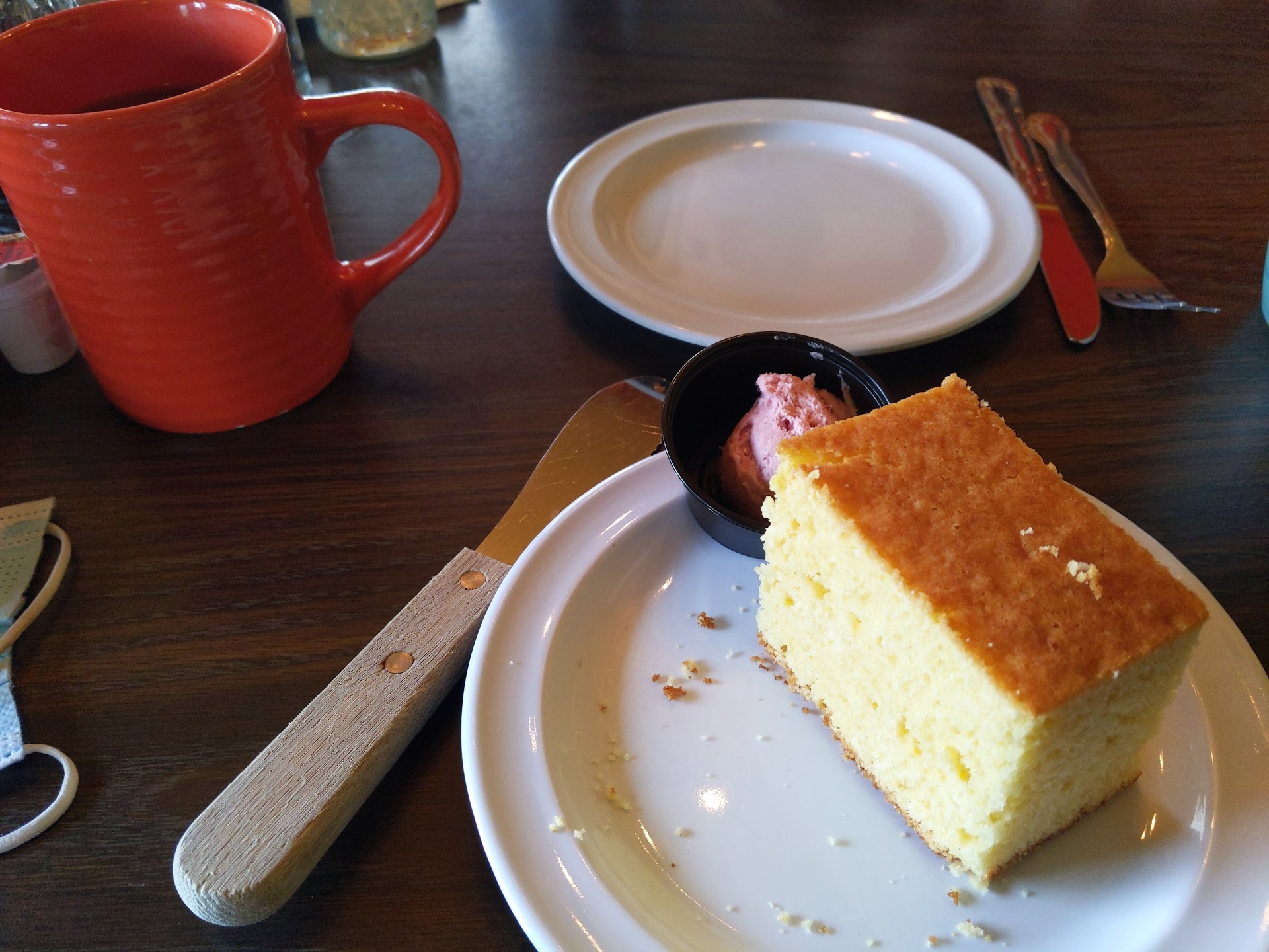 We got the complimentary “corn bread” and some odd butter. The cornbread was dry and cold. And the butter just tasted off. Wasn’t our thing. If the corn bread was warmed it may have been different.