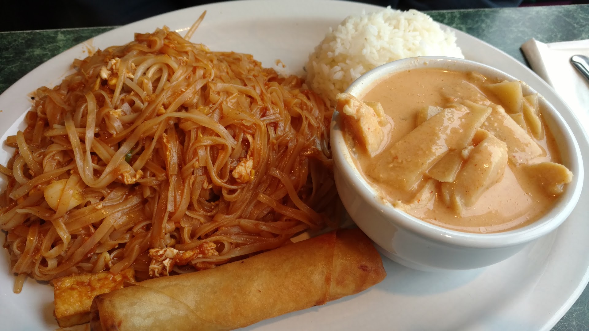 Read moreSo I finally got to try this place after reading all the rave reviews and was quite unimpressed. Place was almost empty except for 2 other tables with a diner at each and yet service was slow but the waiter was polite. I concluded that it has such high reviews probably because the folks who like this place like huge portions of starchy carbs loaded with sweet syrupy sauce. The curry and pad thai combo had almost no protein… just laden with extremely sweet almost ketchupy like sauce with very little ingredients (pic paints a thousand words) but enough noodles to knit a pair of socks with, there were 3 slivers of chicken in the portion cup of chicken curry and cold rice. The Lad Na doesn’t taste like Thai Rad Na, it’s tasted like some chinese beef chow fun with precooked/recooked/microwaved(?) beef and spoiling onions… yuck. Nothing here tasted like Thai food, what a disappointment and prices are not exactly cheap. I can’t recommend this place. Do yourself a a favor and walk a little further down...