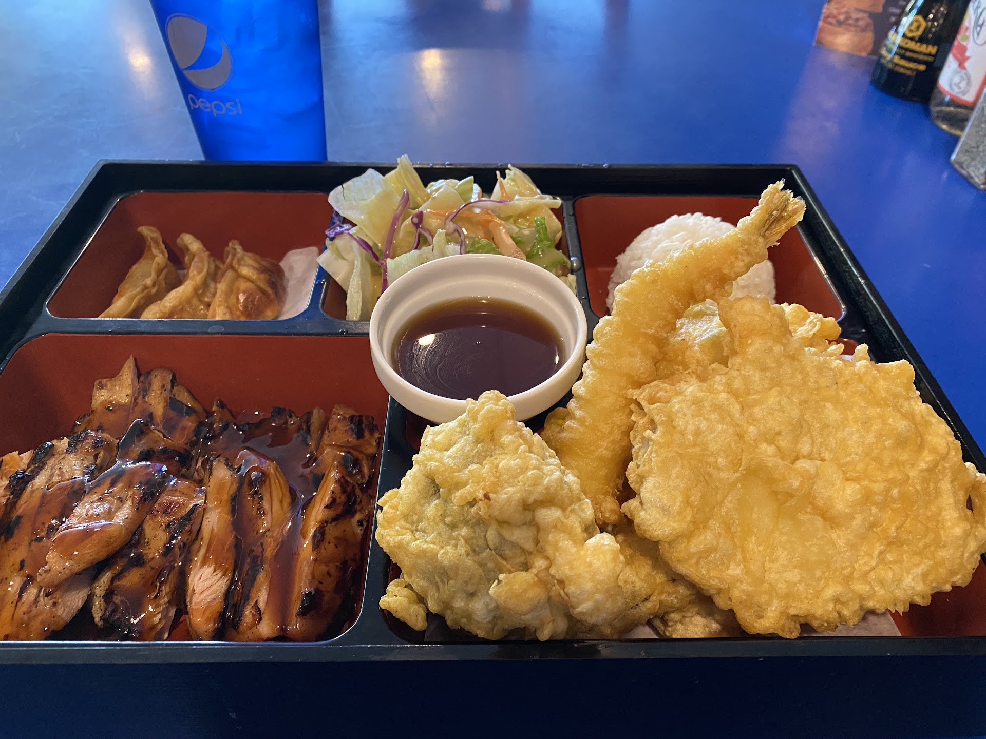Read moreThe server was friendly and seated us right away. The sushi cracker appetizer was excellent, so I don’t doubt the sushi chef is skilled, but the fried food we ordered was disgusting. My daughter is a katsu fiend, but she wouldn’t eat theirs because it had a ton of black pepper on it. We ordered tempura vegetables and orange chicken with fried rice. All 3 dishes, but the chicken especially, was unusually dark and tasted bad, like the oil hadn’t been changed and/or they use the same fryers for different meats. It also had lemon slices in it instead of orange, but that was the least of the dish’s problems. I can say without exaggeration that the orange chicken and fried rice you can get from a Safeway deli is superior to what I was served. I spoke with the owner and rather than being apologetic, she was immediately defensive and asked me to walk back and look at her fryers. I should’ve called her bluff, but we only wanted to provide feedback and go. There are a lot of sushi and teriyaki spots, so this one won’t see us again.