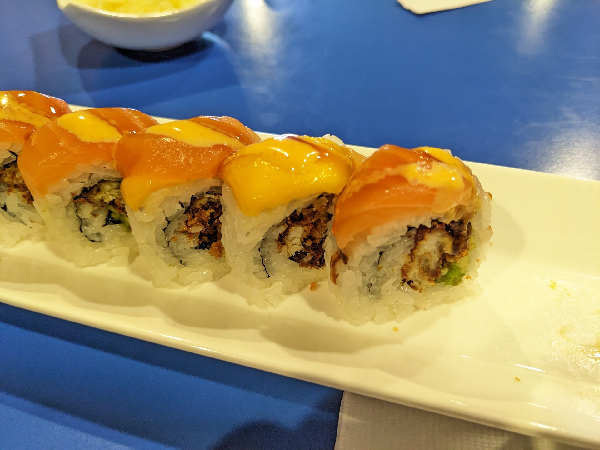 I want to like this place but I've ended up disappointed both times I tried it. The first time I ordered the Delicious Roll, and maybe I just didn't know what to expect, but the crab meat was heavily breaded and deep fried and half of the roll was just rice. In defense of the roll, the flavor was very strong and the rice helped balance it. I asked for and received $5 off my next order since I wanted to try them again. The service on this visit felt slow. The original table where I was placed didn't seem like it had been scrubbed clean. Oh yeah. And there was no mango puree on top - I was told the menu was out of date. Today I ordered the 3 for $33 special. The service was very pleasant. When I got home I checked the order and what I found was Lion king: check. Tasty enough, no regrets. Green grin: the picture on the website made it seem like the yam would be baked, and what I got instead was a thin strip of yam deep fried. This left the roll being mostly deep fried batter where the other flavors are irrelevant. Not what I was hoping for or expecting. I doubt I'll finish it. Golden California: I did not receive this. What I received was a California roll with avocado on top. Not at all what the description says, so somehow they messed up the order, which the woman confirmed over the phone.